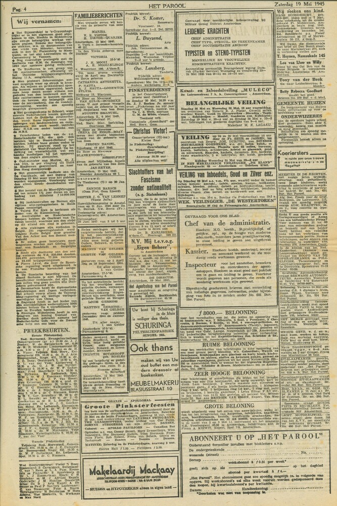 Het Parool, 19 mei 1945, 5e jaargang, No 111