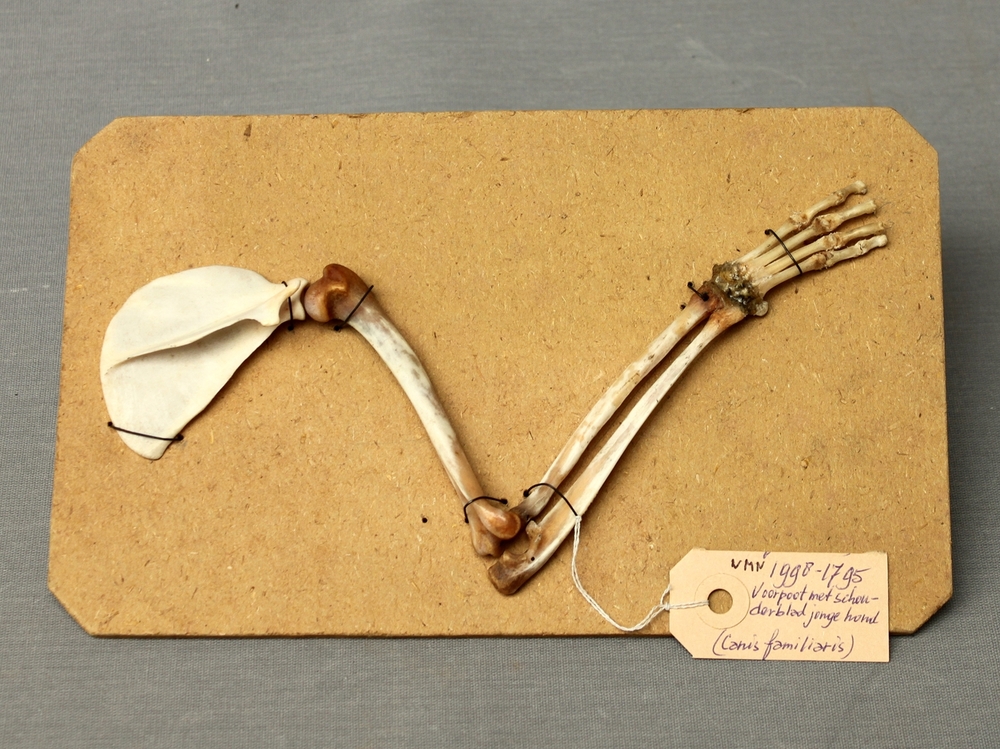 Hond; juveniel; skelet voorpoot met schouderblad; op...