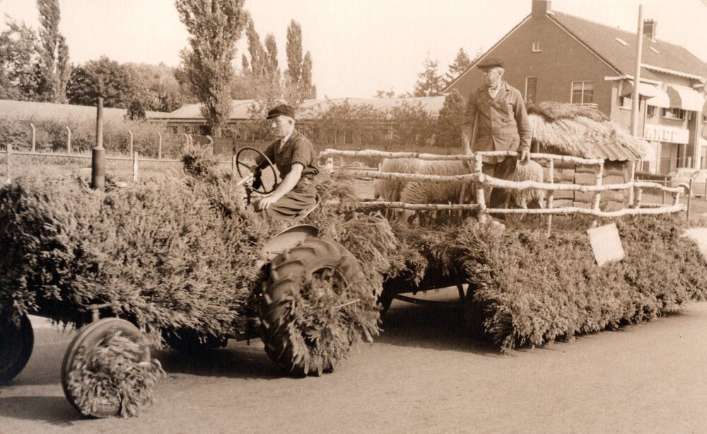 Een met heide versierde tractor met praalwagen