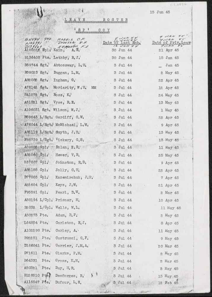 Kopie: Leave Roster 'SD' Coy 15 Jun 45.