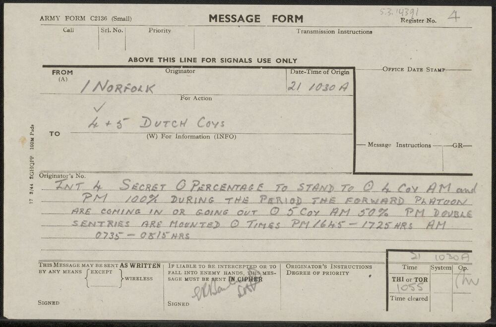 Bericht van 1 Norfolk aan 4 + 5 Dutch Coys, d.d. 21 ...
