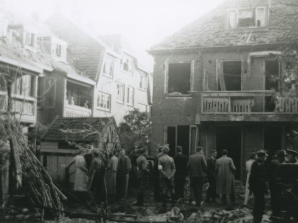 Foto van door bominslag beschadigd huis in Amsterdam...