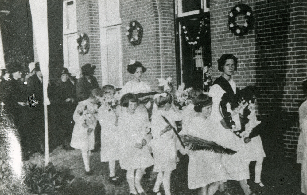 Zwart-wit foto van een optocht ter gelegenheid van e...