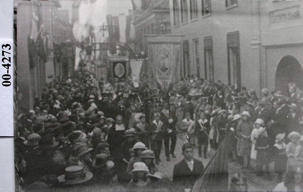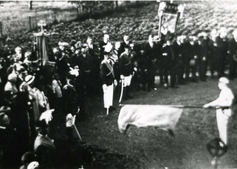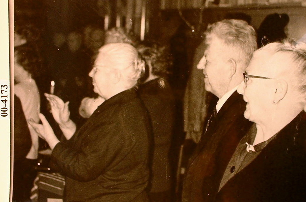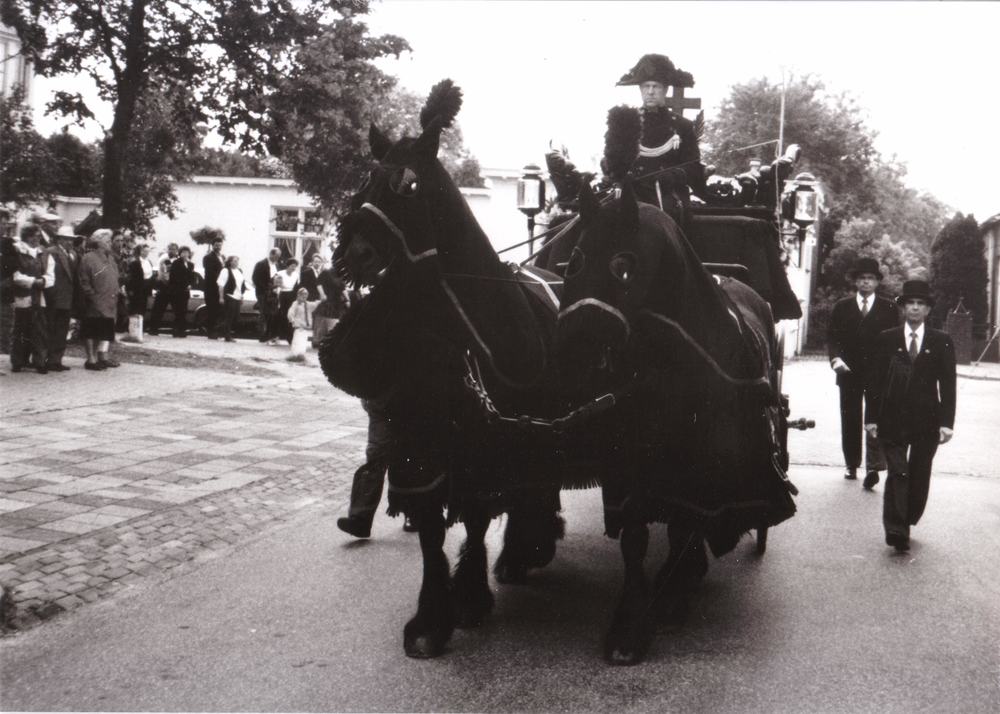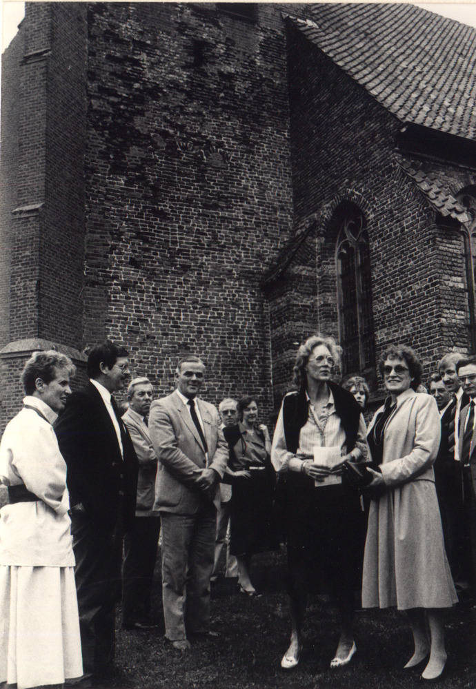 Zwart-wit foto van de statenleden bij de kerk in Aer...