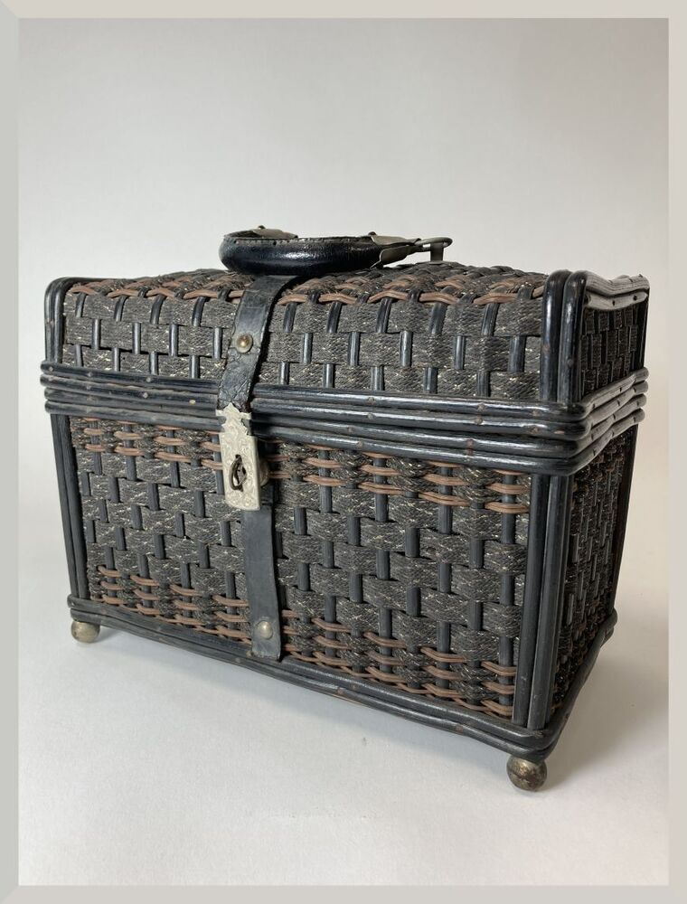 Mandje, koffermodel, van bamboe en zwarte banden met...