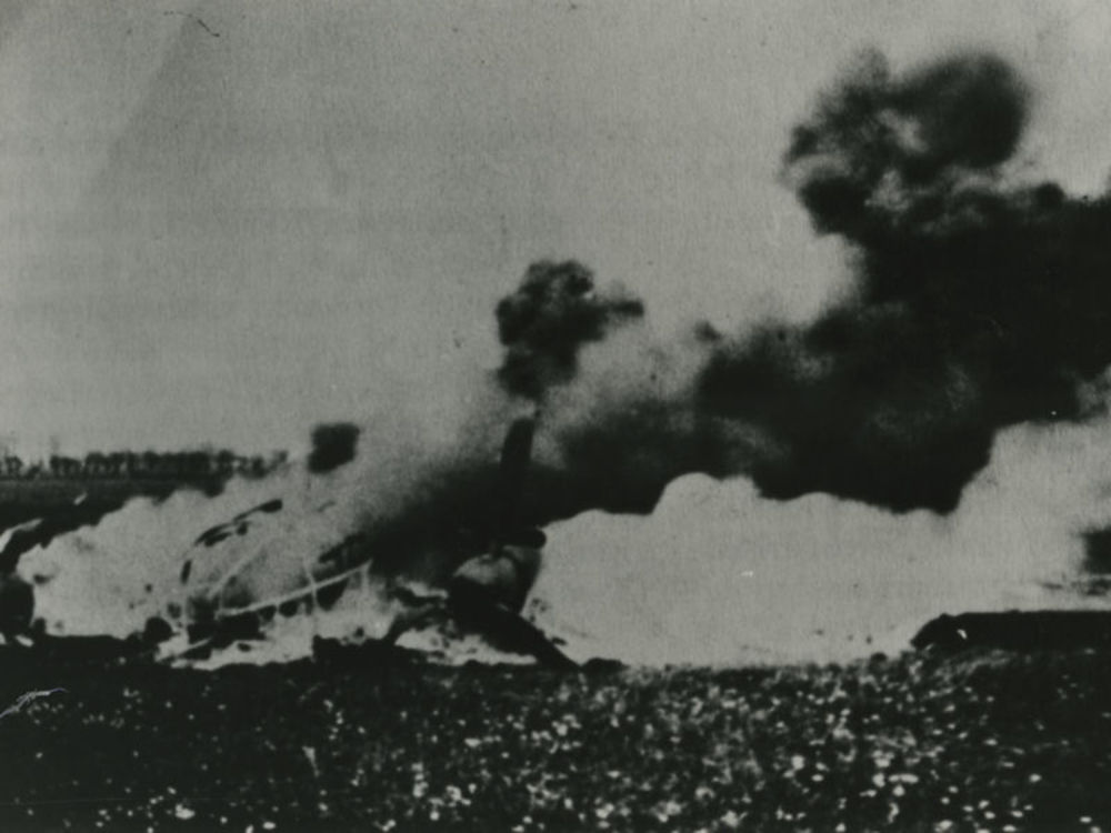 Foto brandend wrak Heinkel He 111 bommenwerper. Teks...