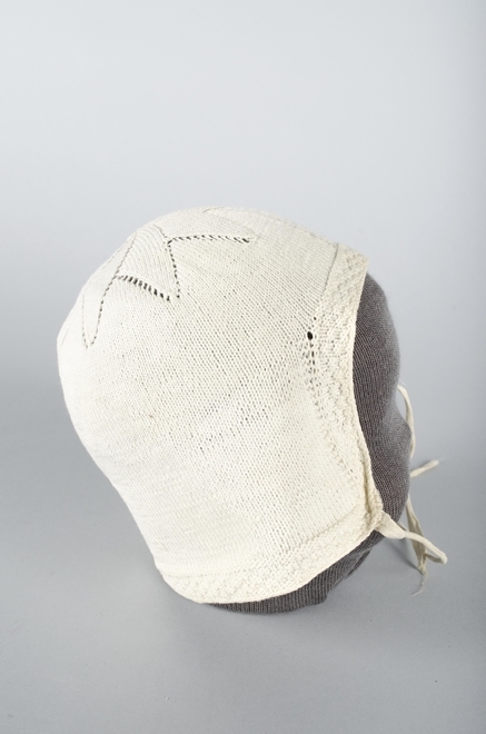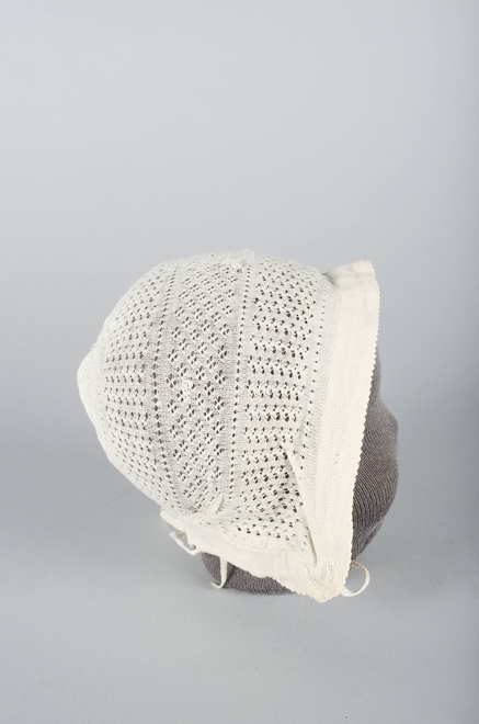 Wit katoenen mutsje, machinaal ajour gebreid, onderd...