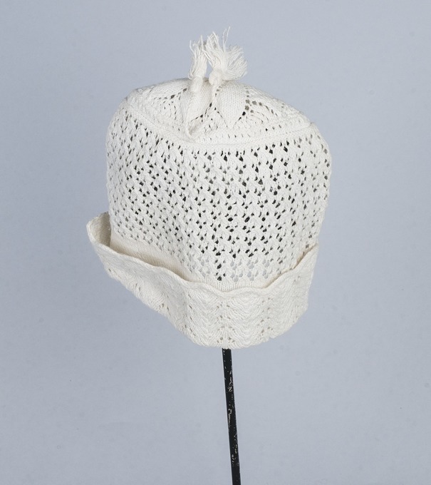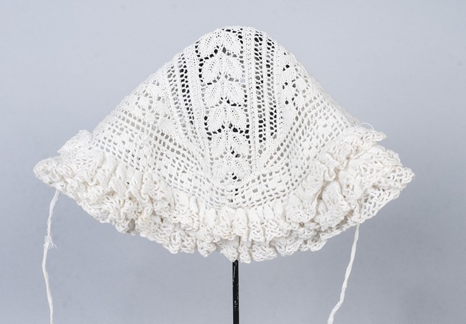 Wit gehaakte katoenen mutsje, onderdeel van groep va...