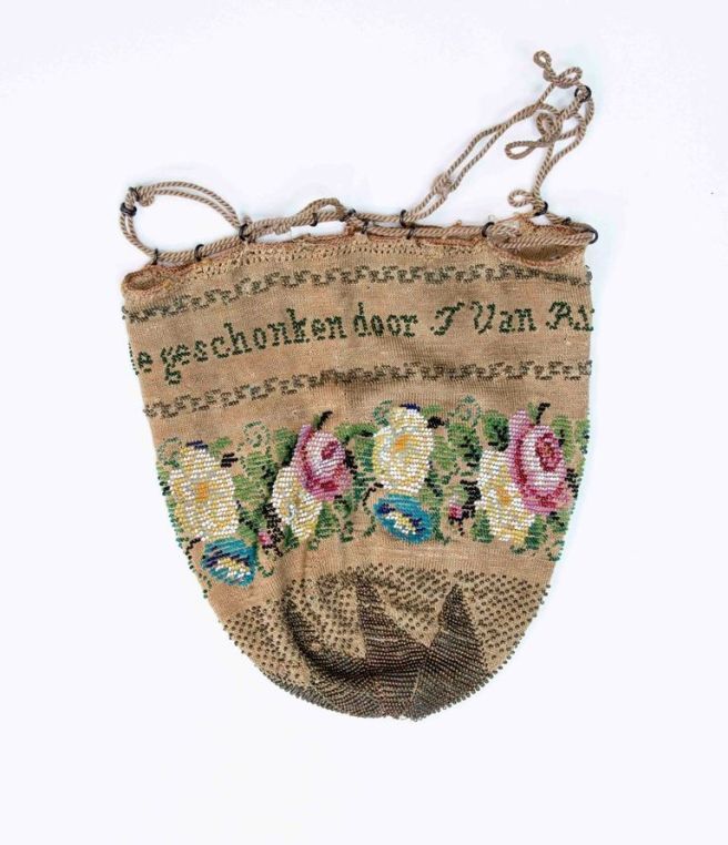 Gebreid tasje met kralen met de tekst: Uit moederlie...