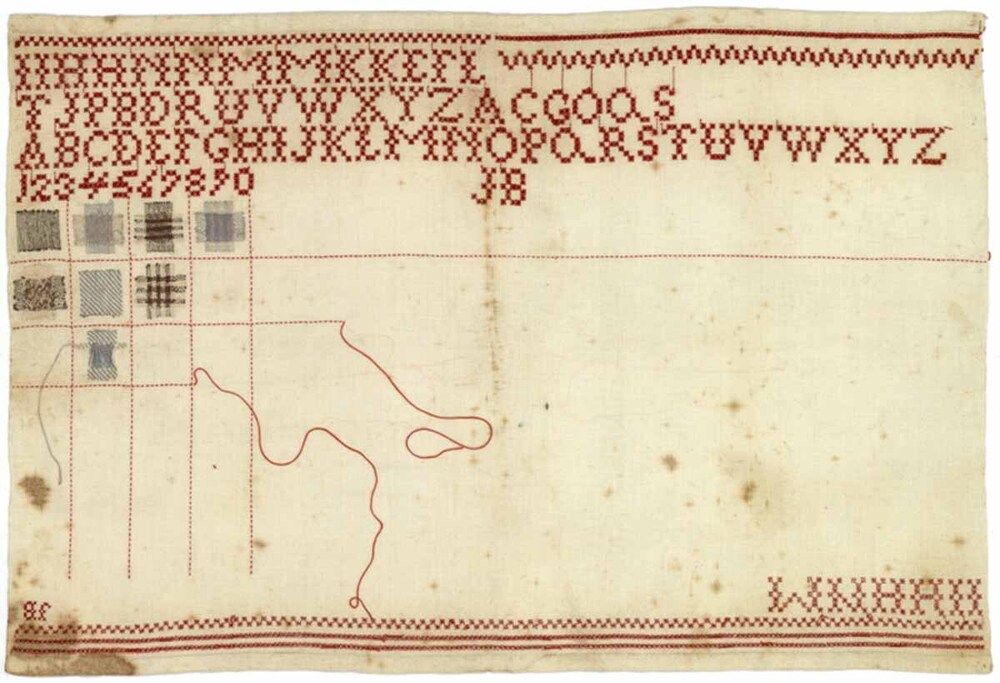 Letterstoplap onaf, met rood garen, gemerkt J.B.