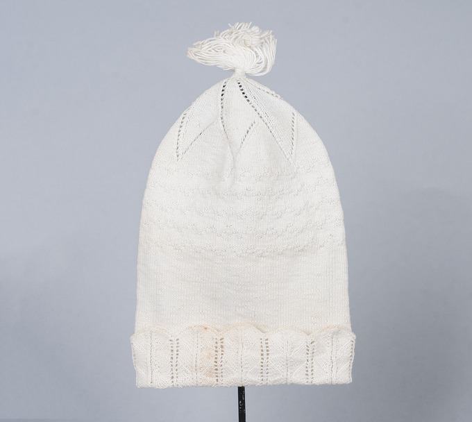 Kindermutsje van wit gebreide en gehaakte katoen, kw...