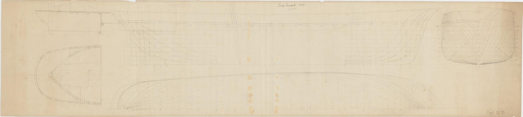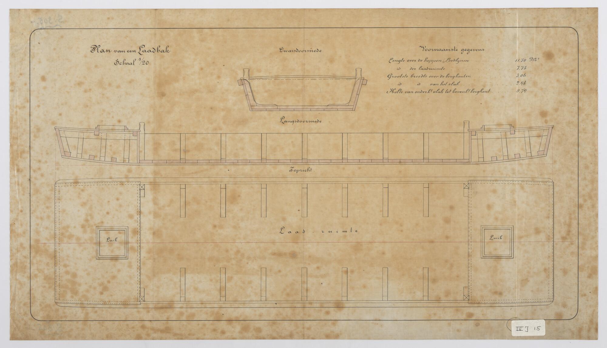 Verticale langsdoorsnede, spantenraam, waterlijnen, ...