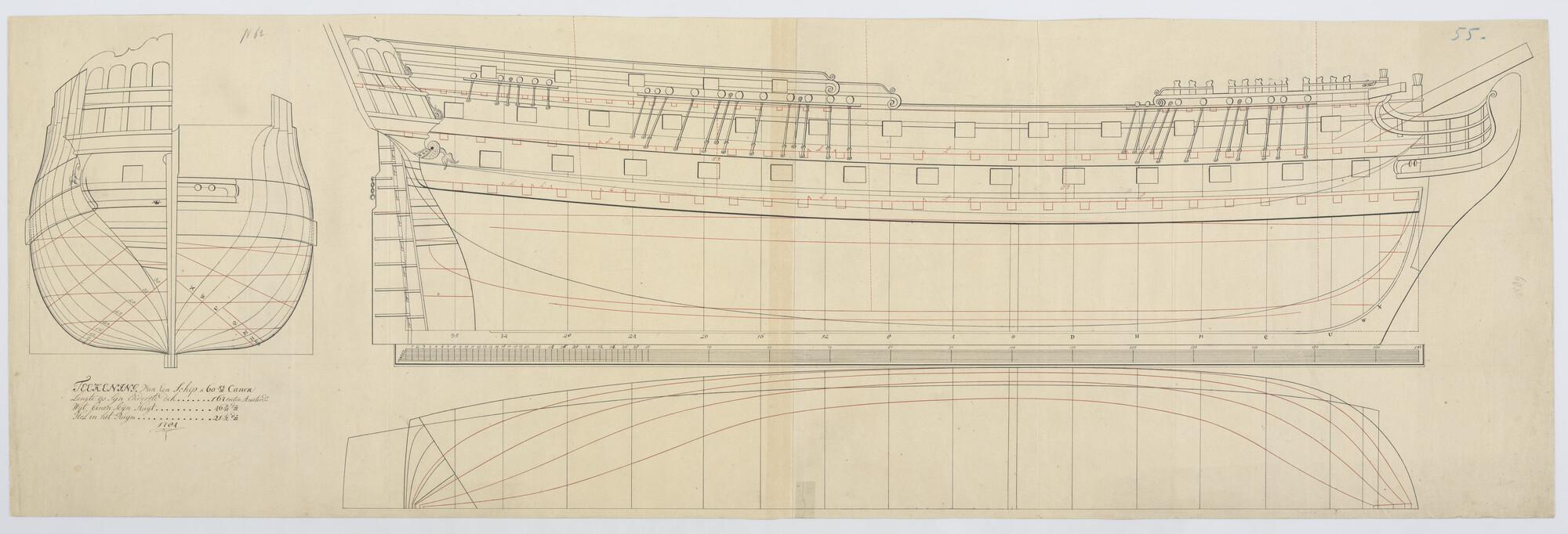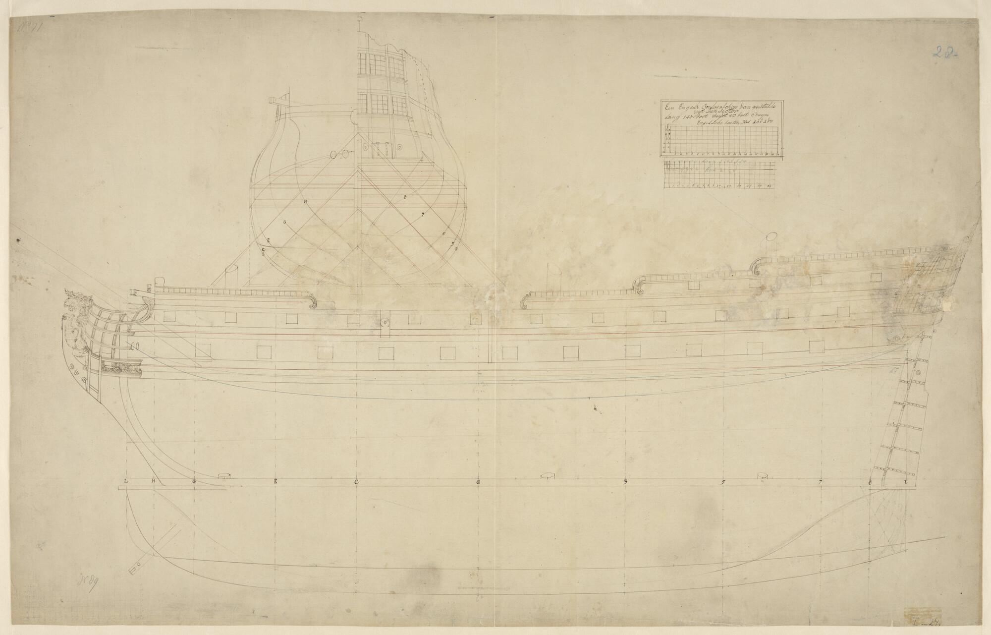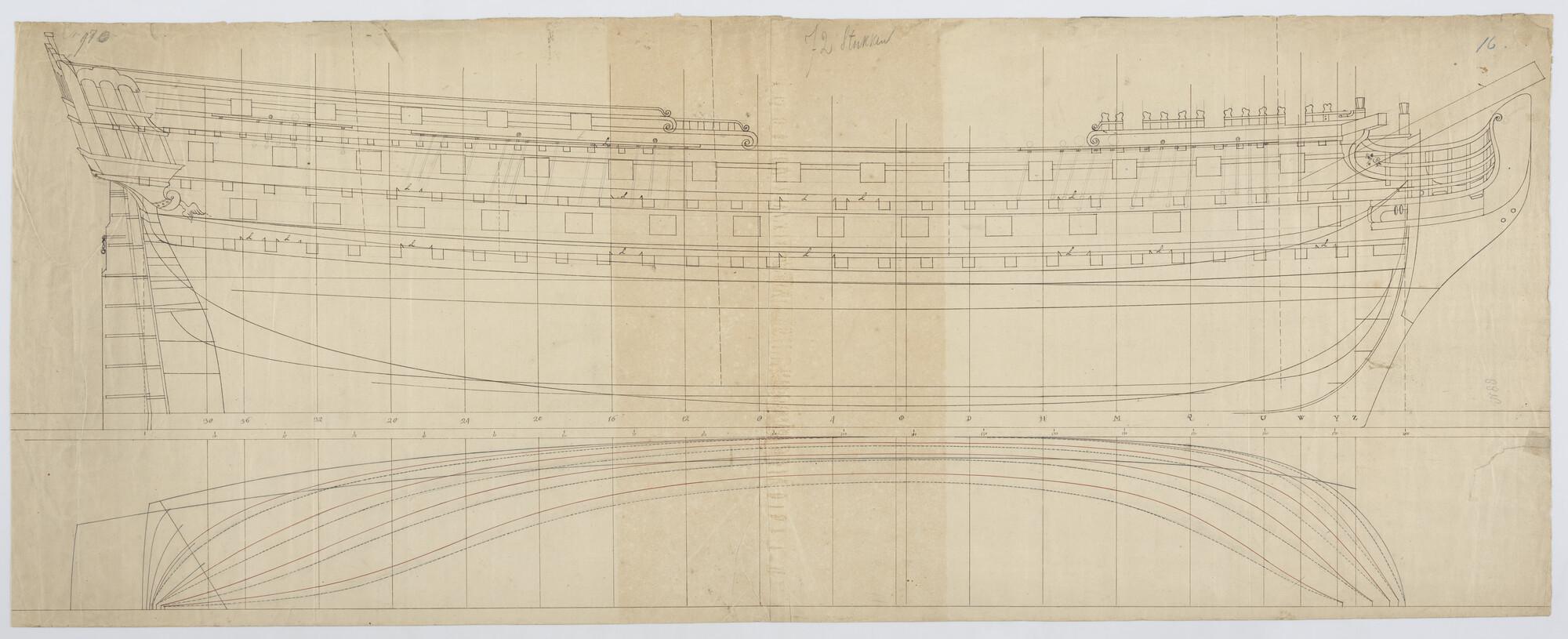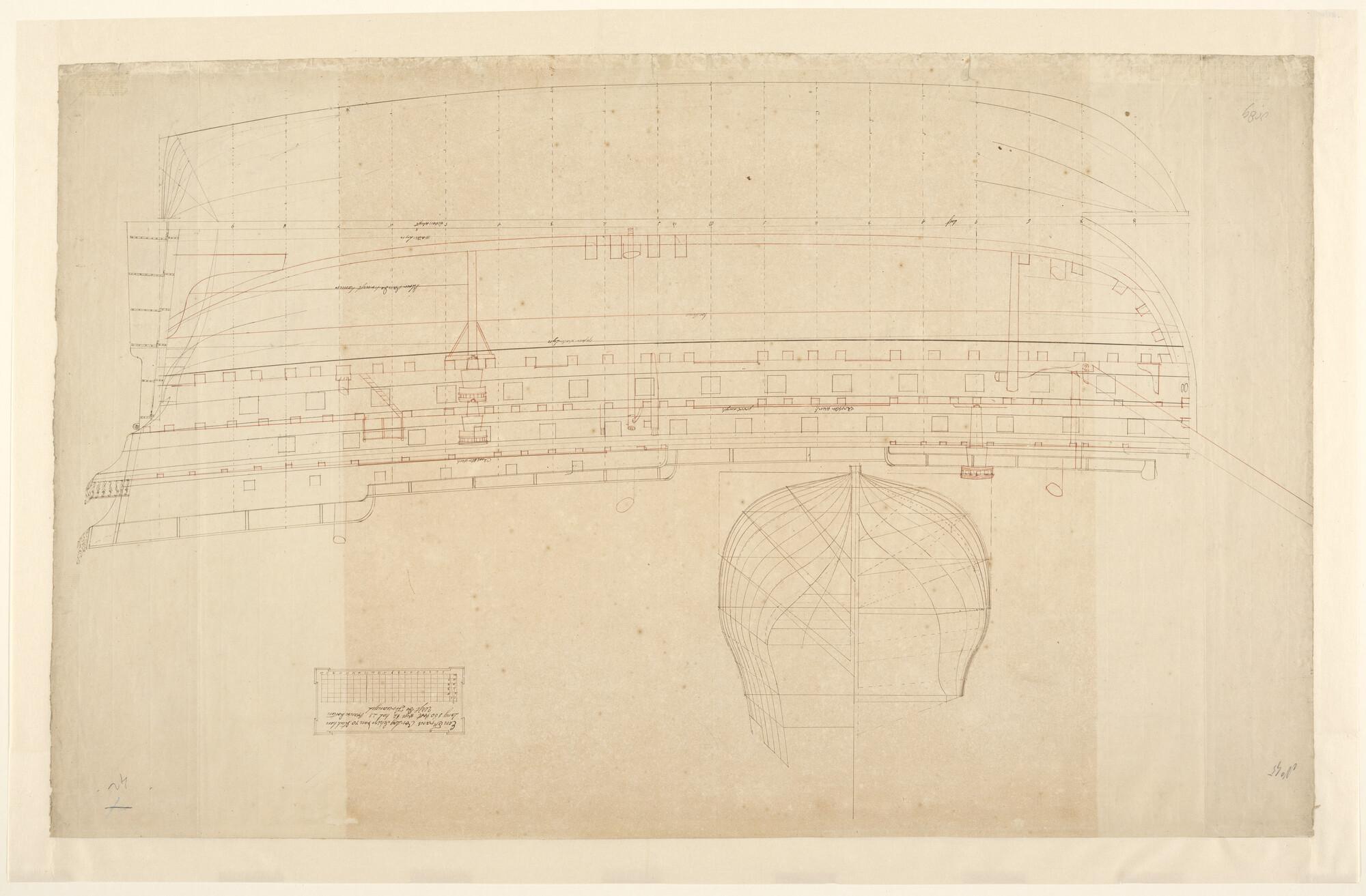 Lijnenplan van een Frans oorlogsschip van 74 stukken