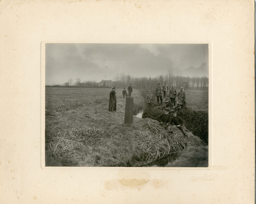 Zwart-wit foto van de Nederlandse en Duitse grenswac...