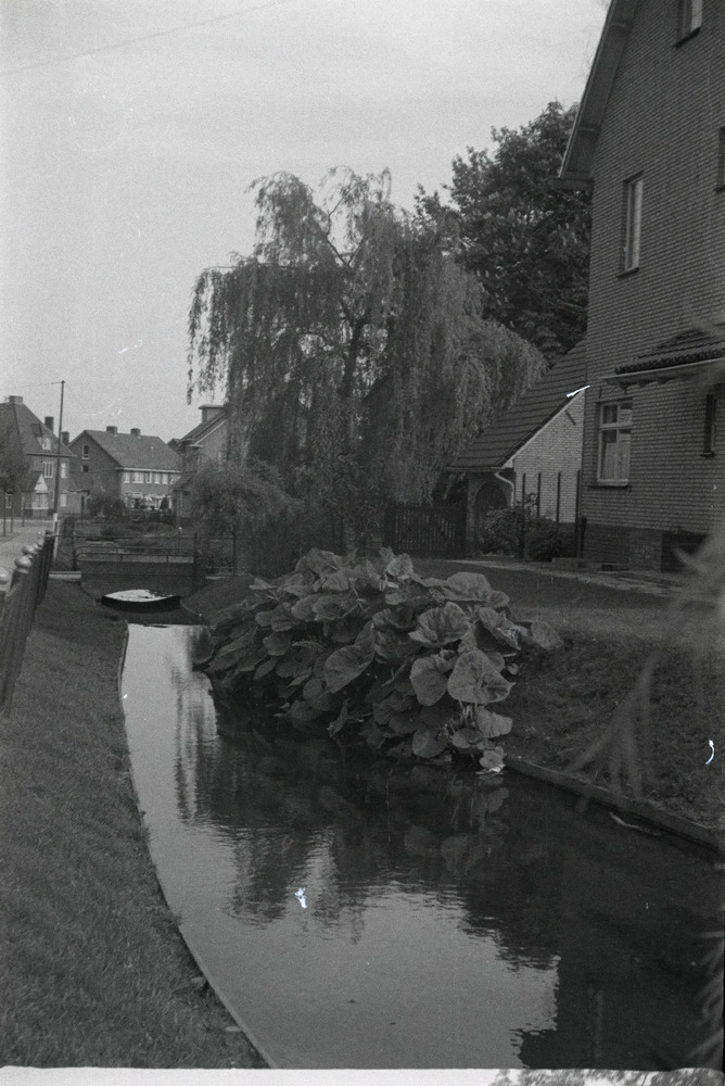 Een foto van een straat met huizen en een sloot.