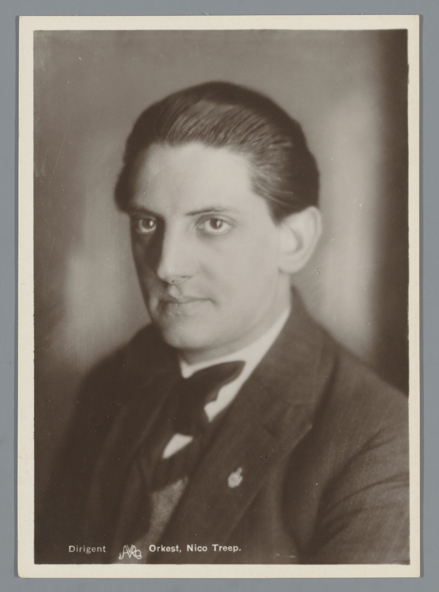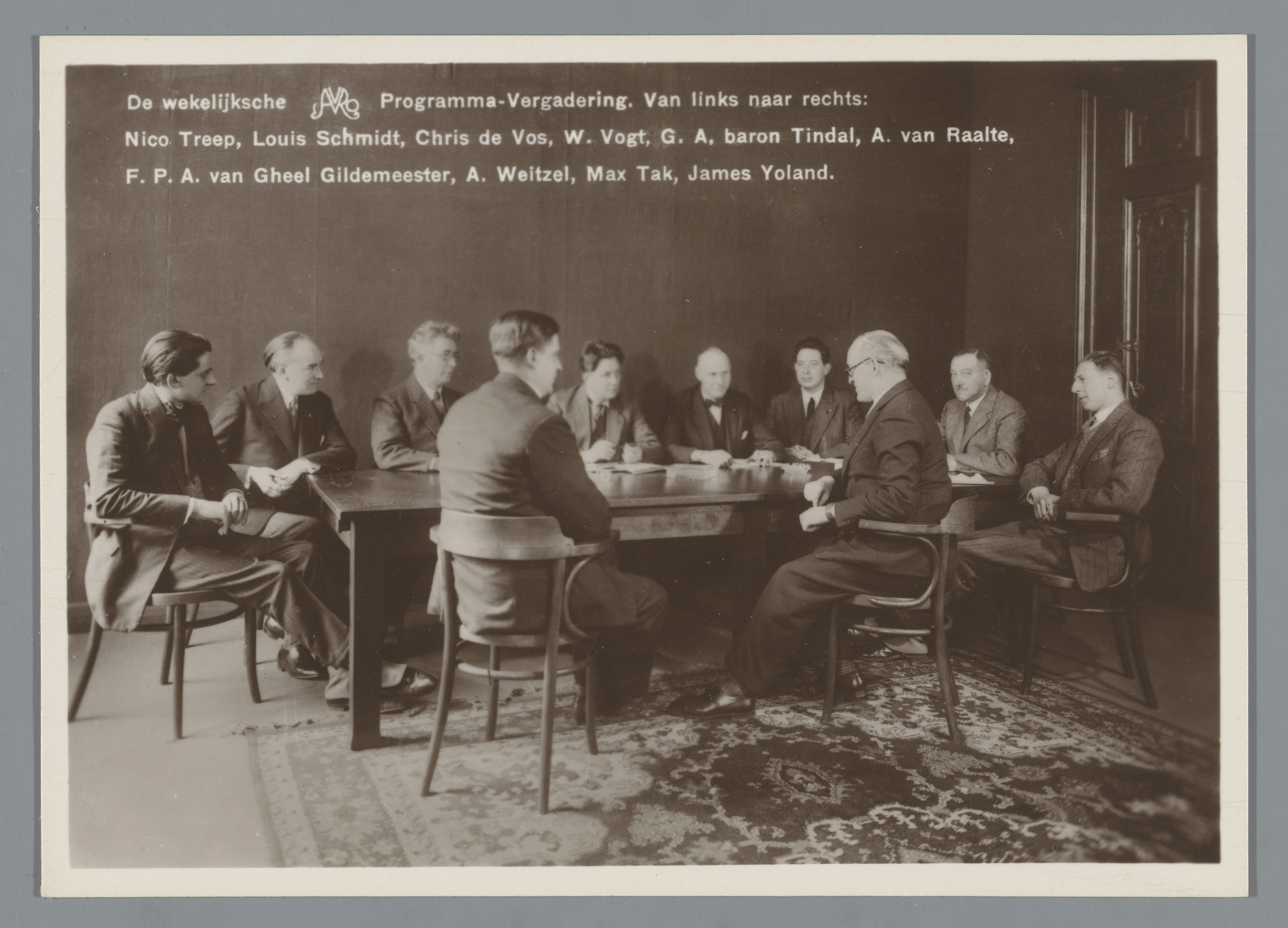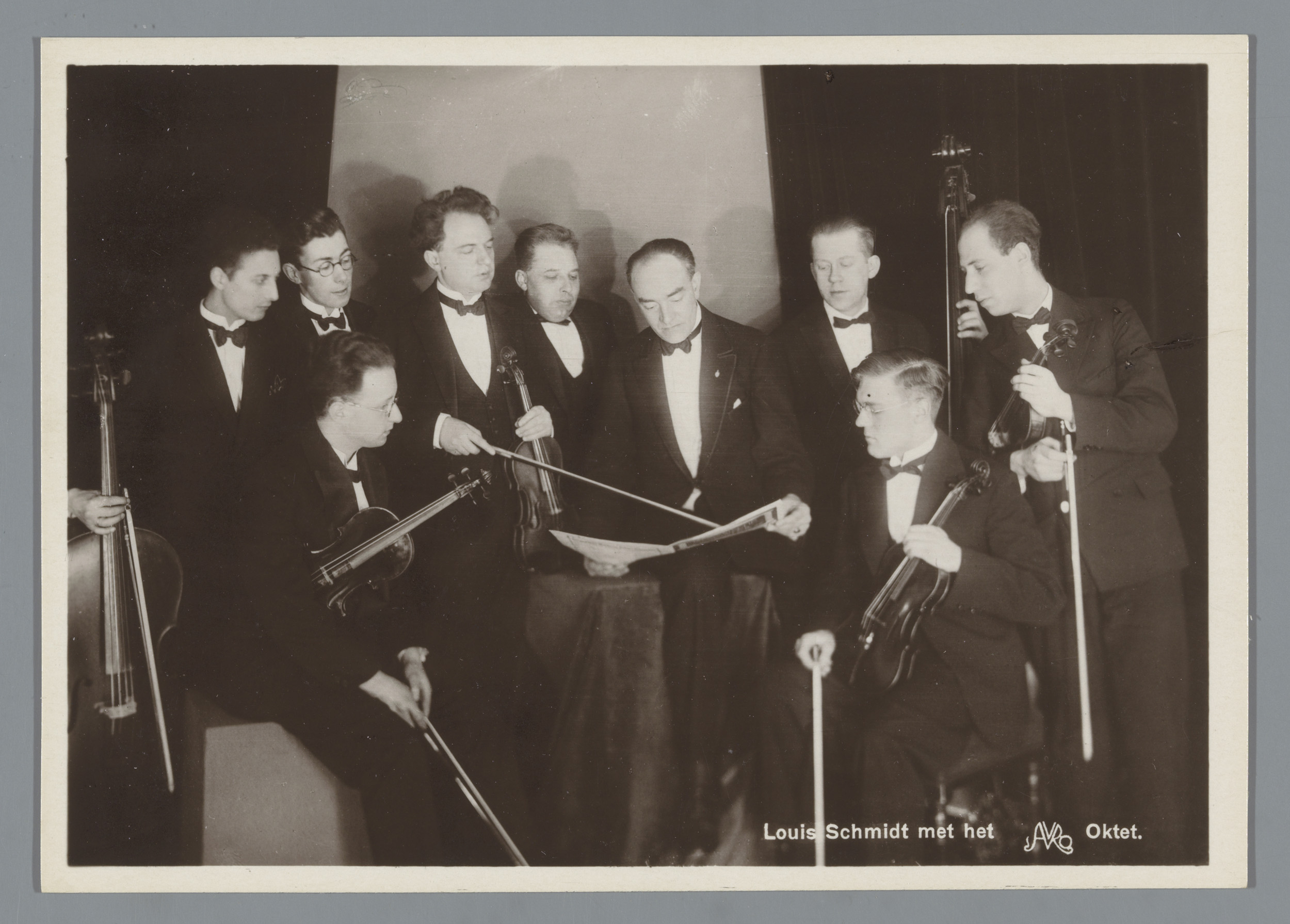 Groepsportret van het A.V.R.O. orkest met Louis Schmidt