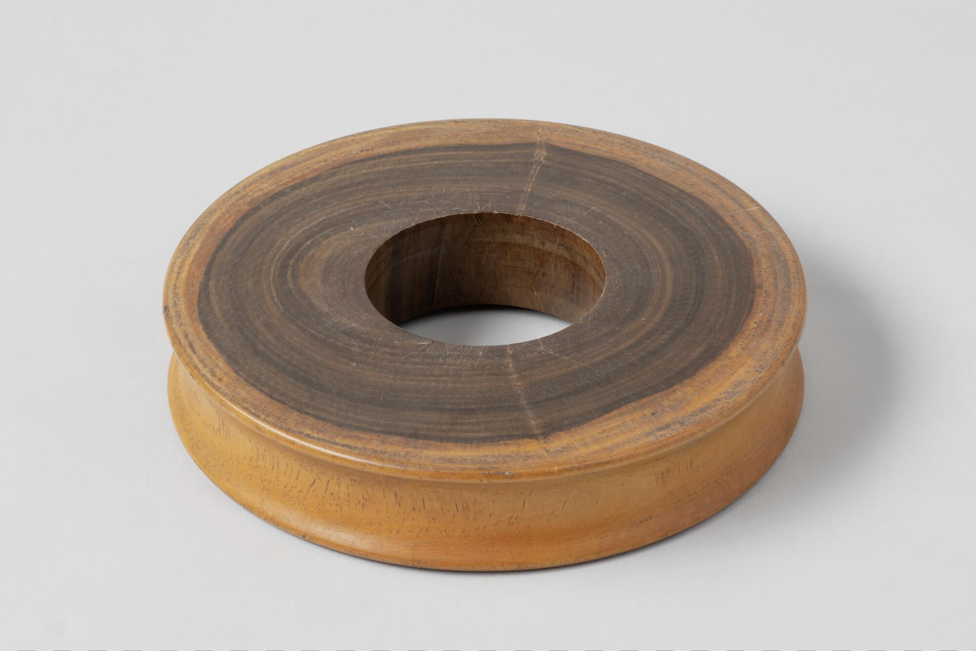 Blok, vruchtboomhout, met twee bronzen schijven en i...