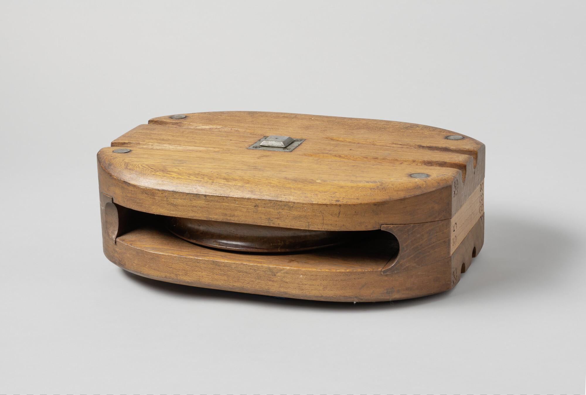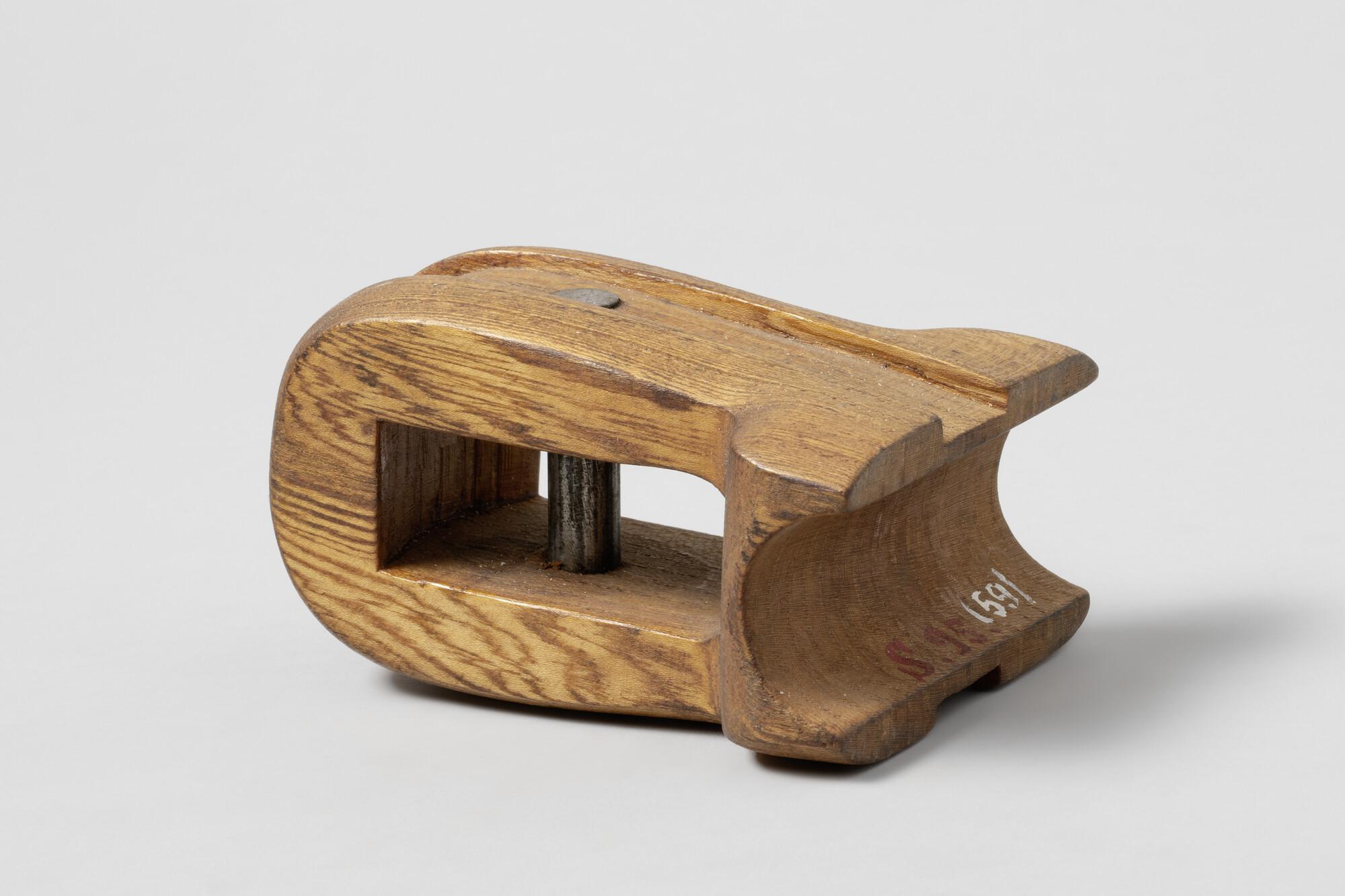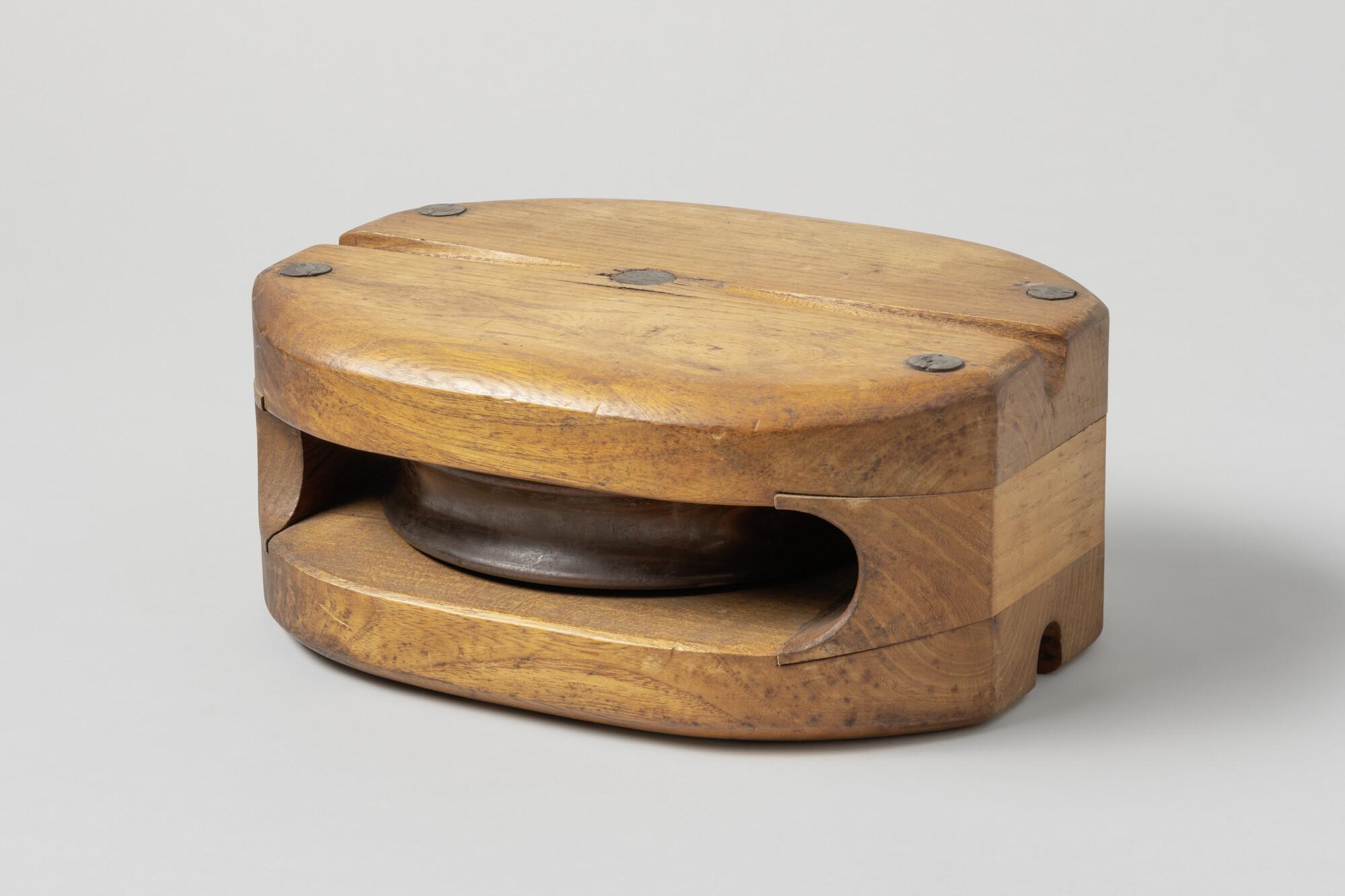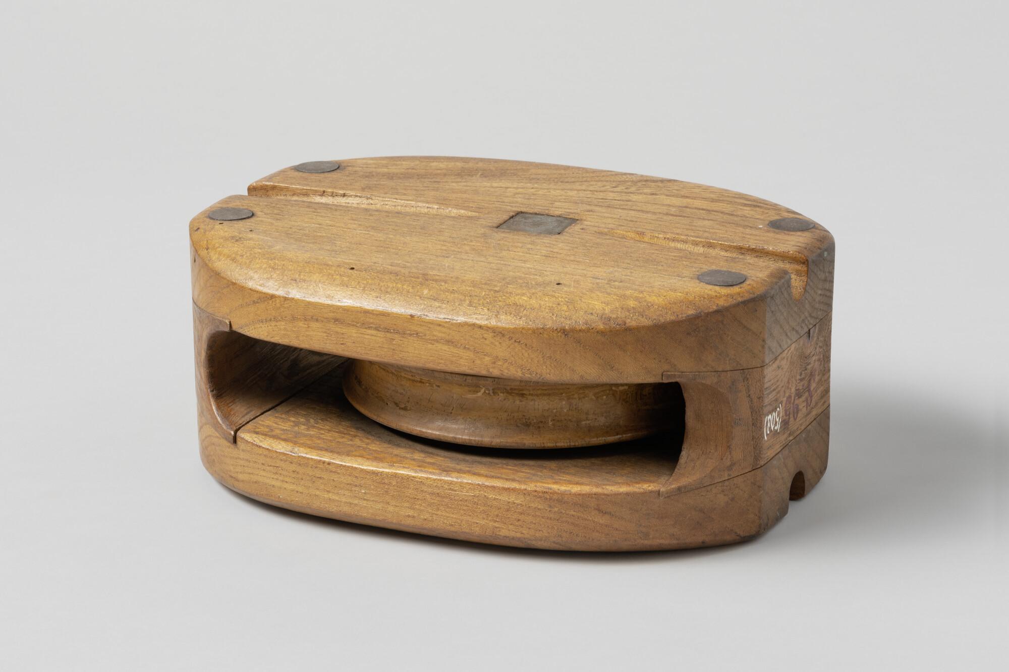 Iepenhouten blok met pokhouten schijven, ijzeren nagel