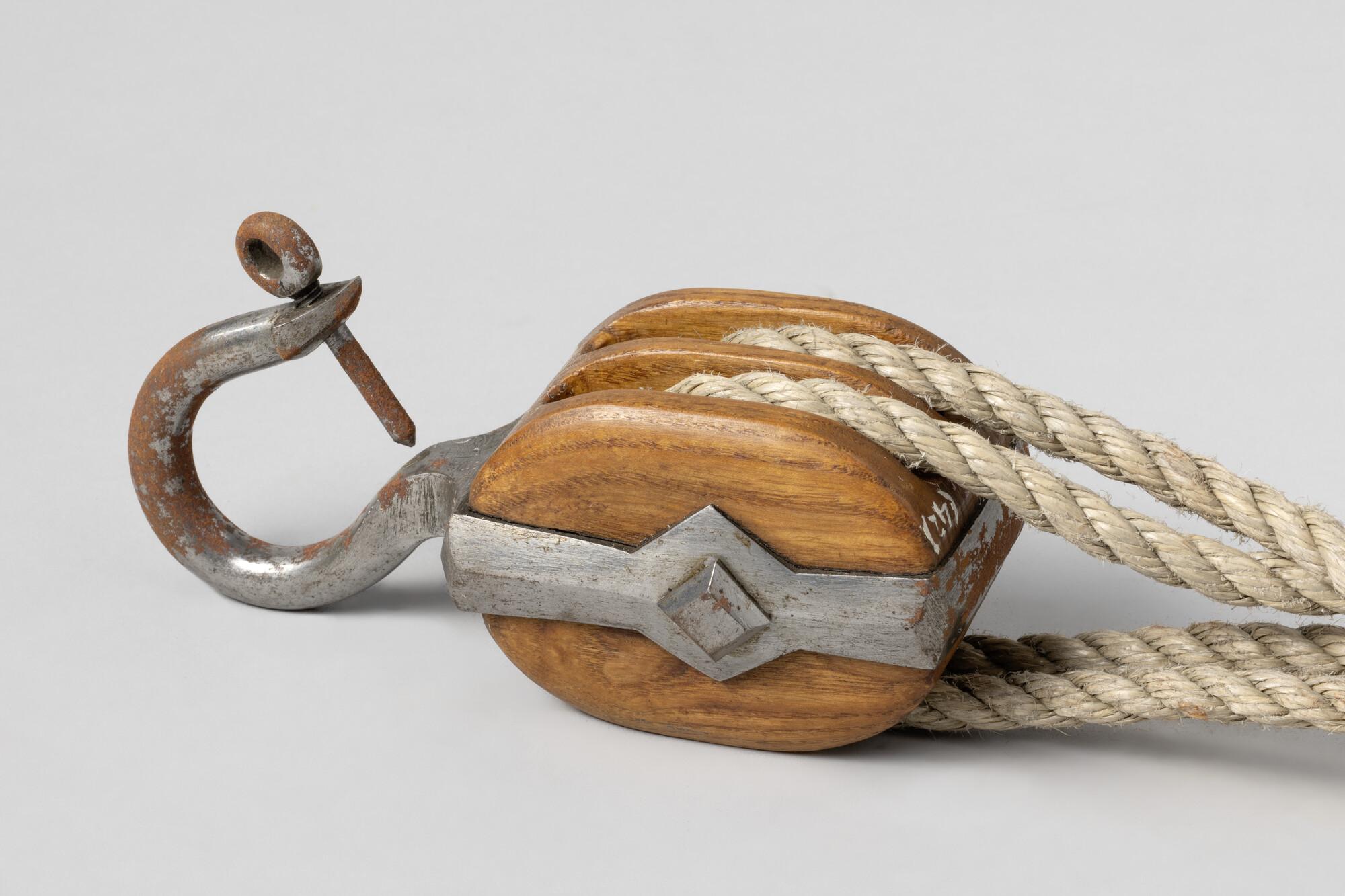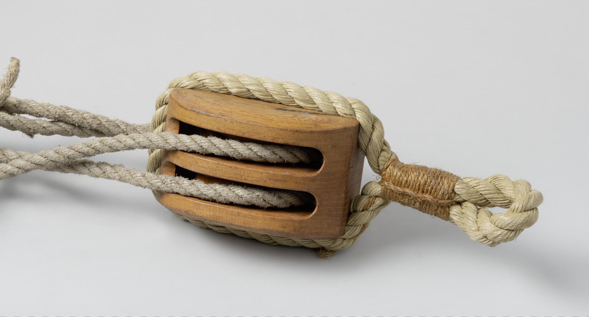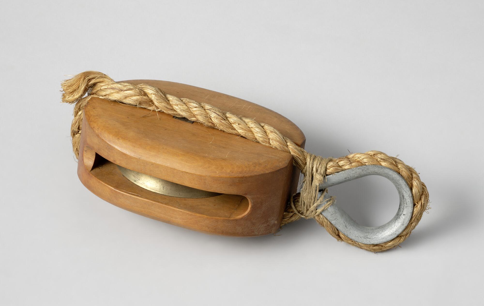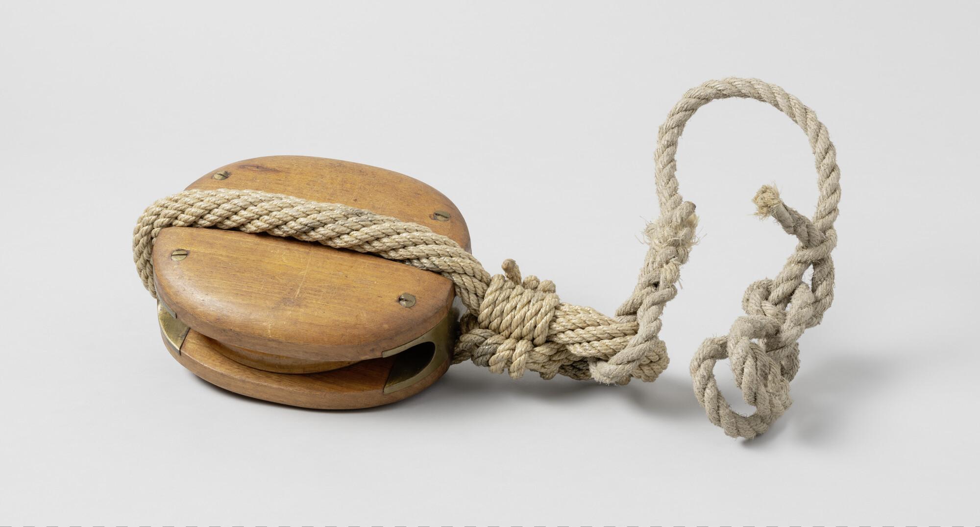 Iepenhouten blok met pokhouten schijven, ijzeren nagel
