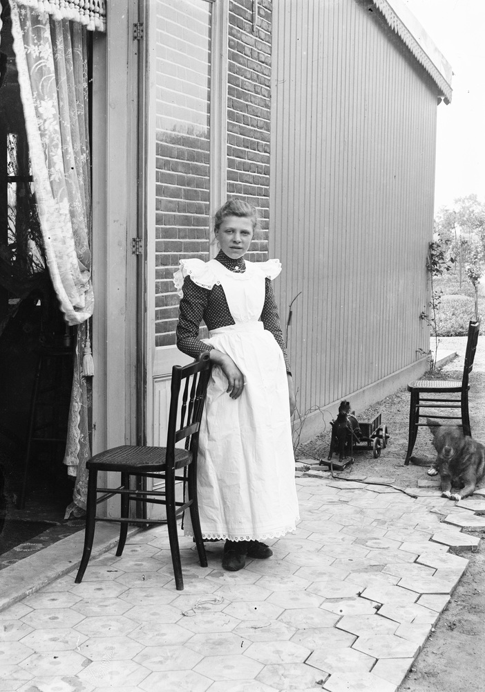 Portret van een dienstbode ten voeten uit staand op ...