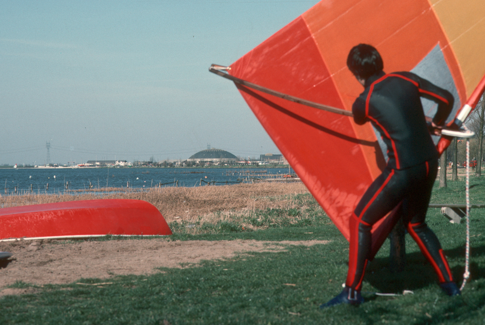 Een surfer met surfzeil bij een van de strandjes lan...