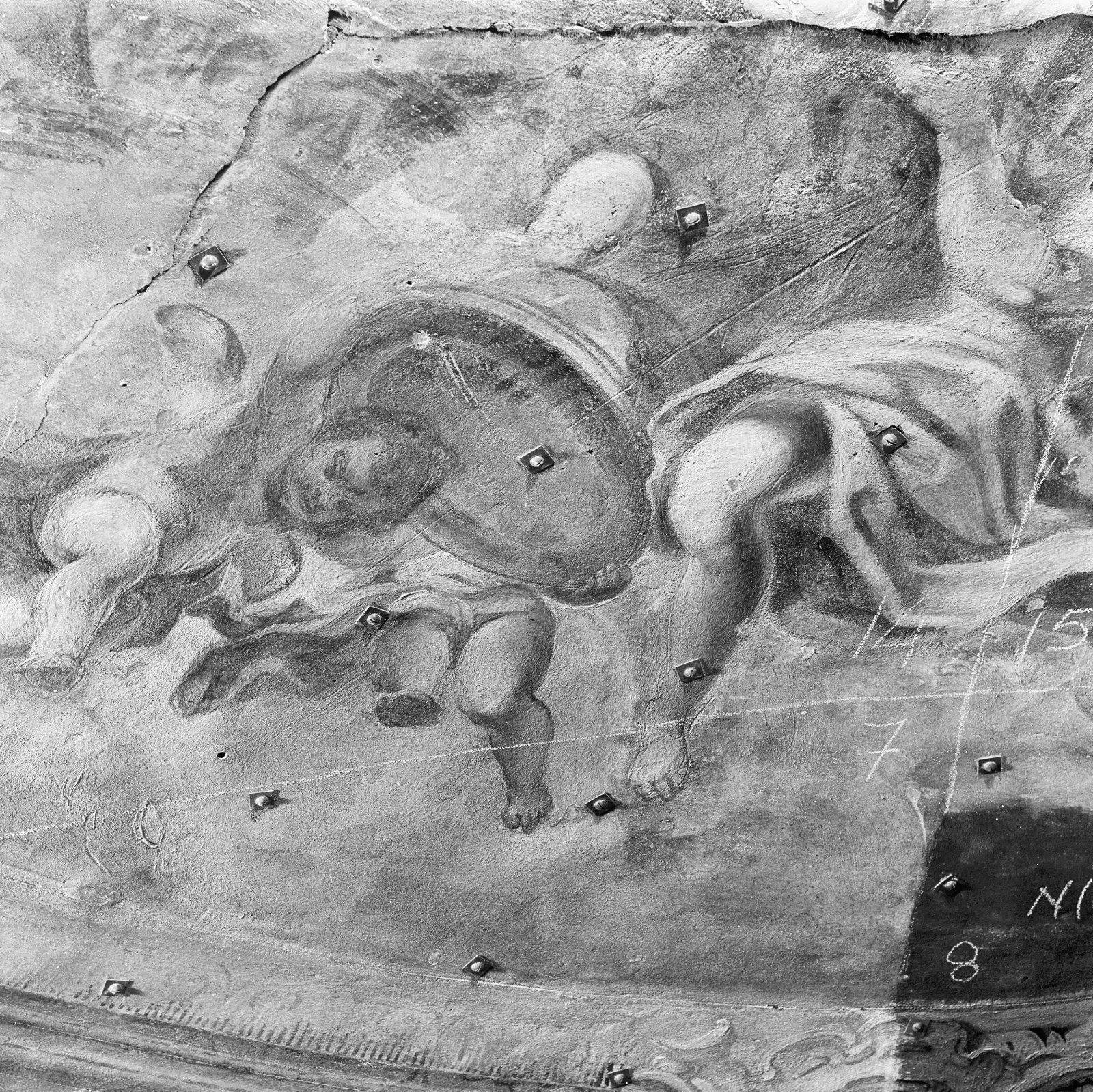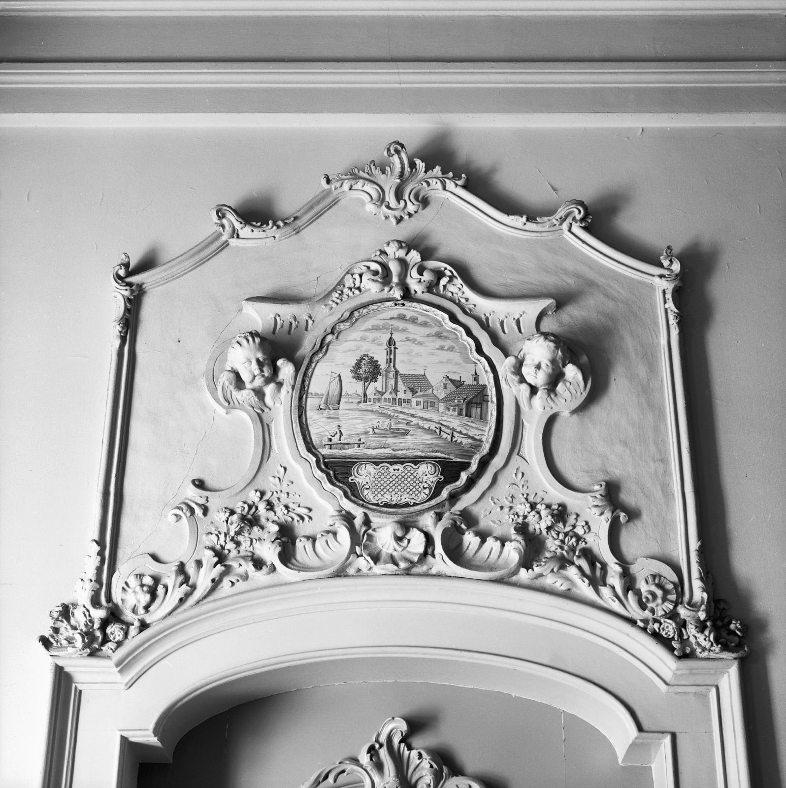 Interieur hal, bovendeurstuk: stucwerk rond een kera...
