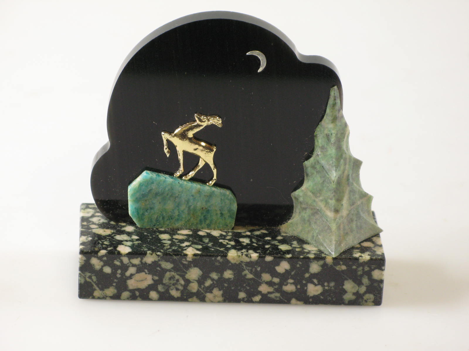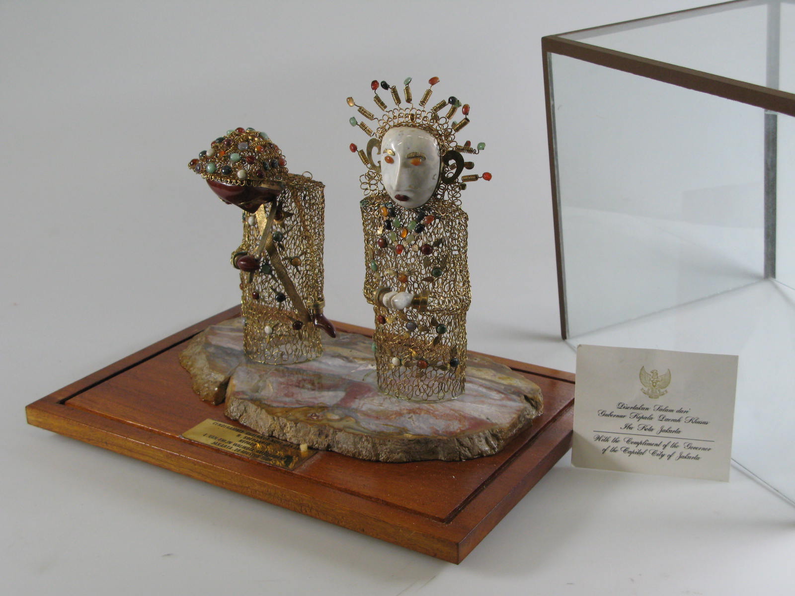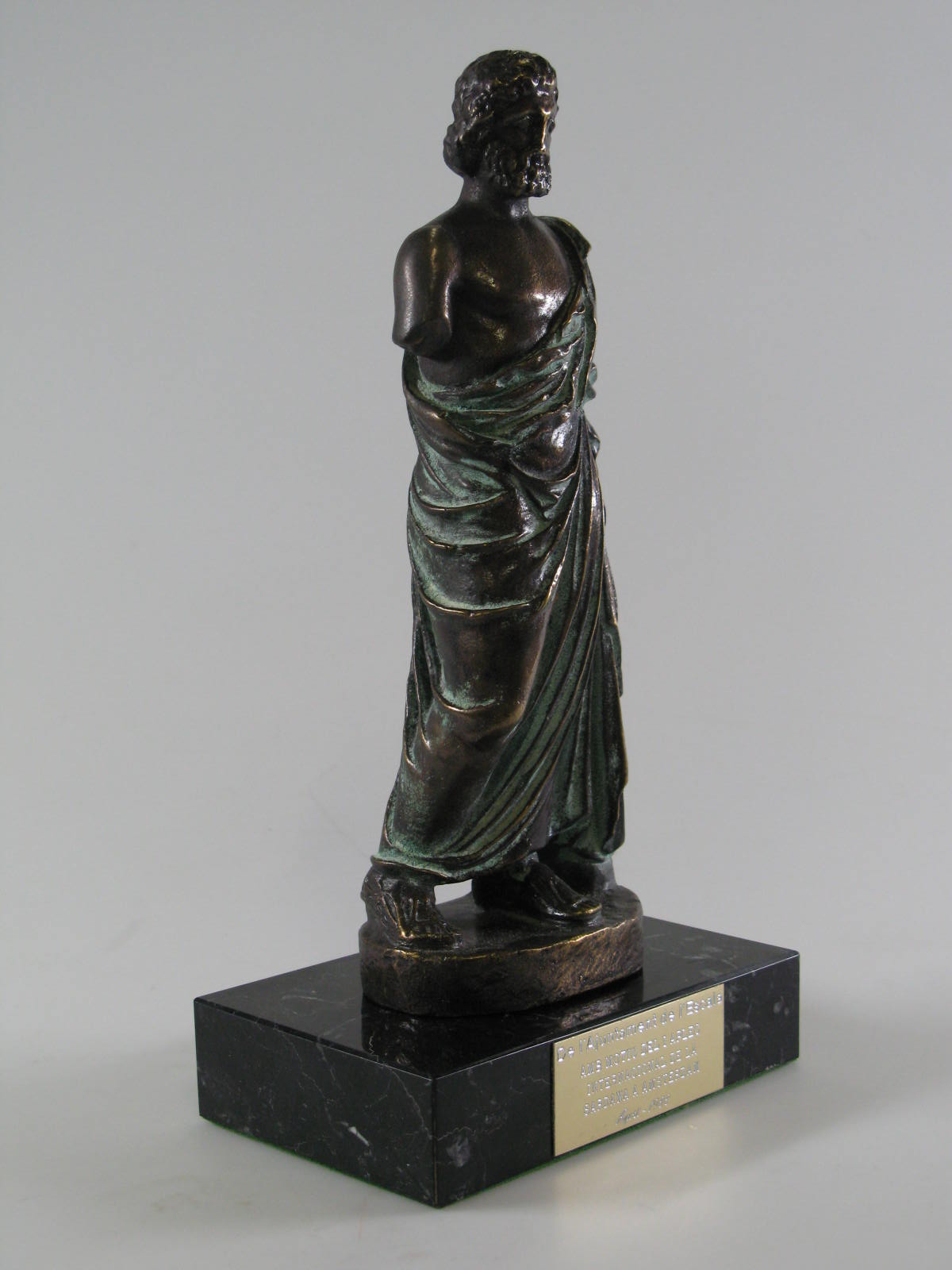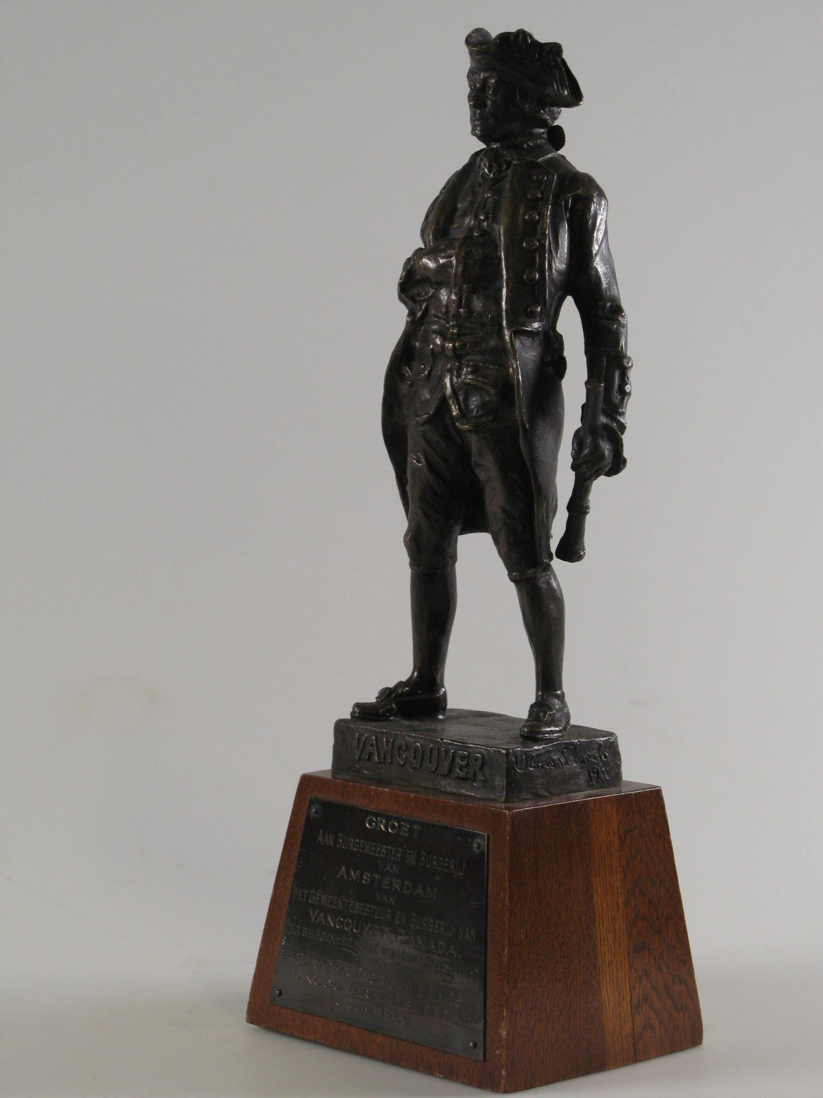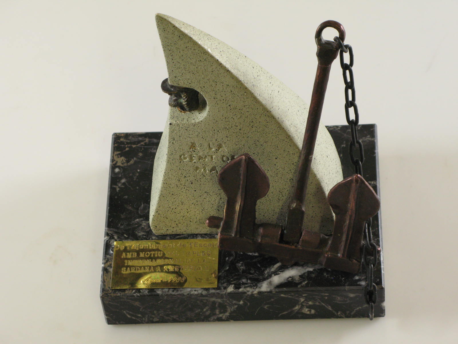 Beeld op zwarte stenen sokkel, geschonken aan Wethou...
