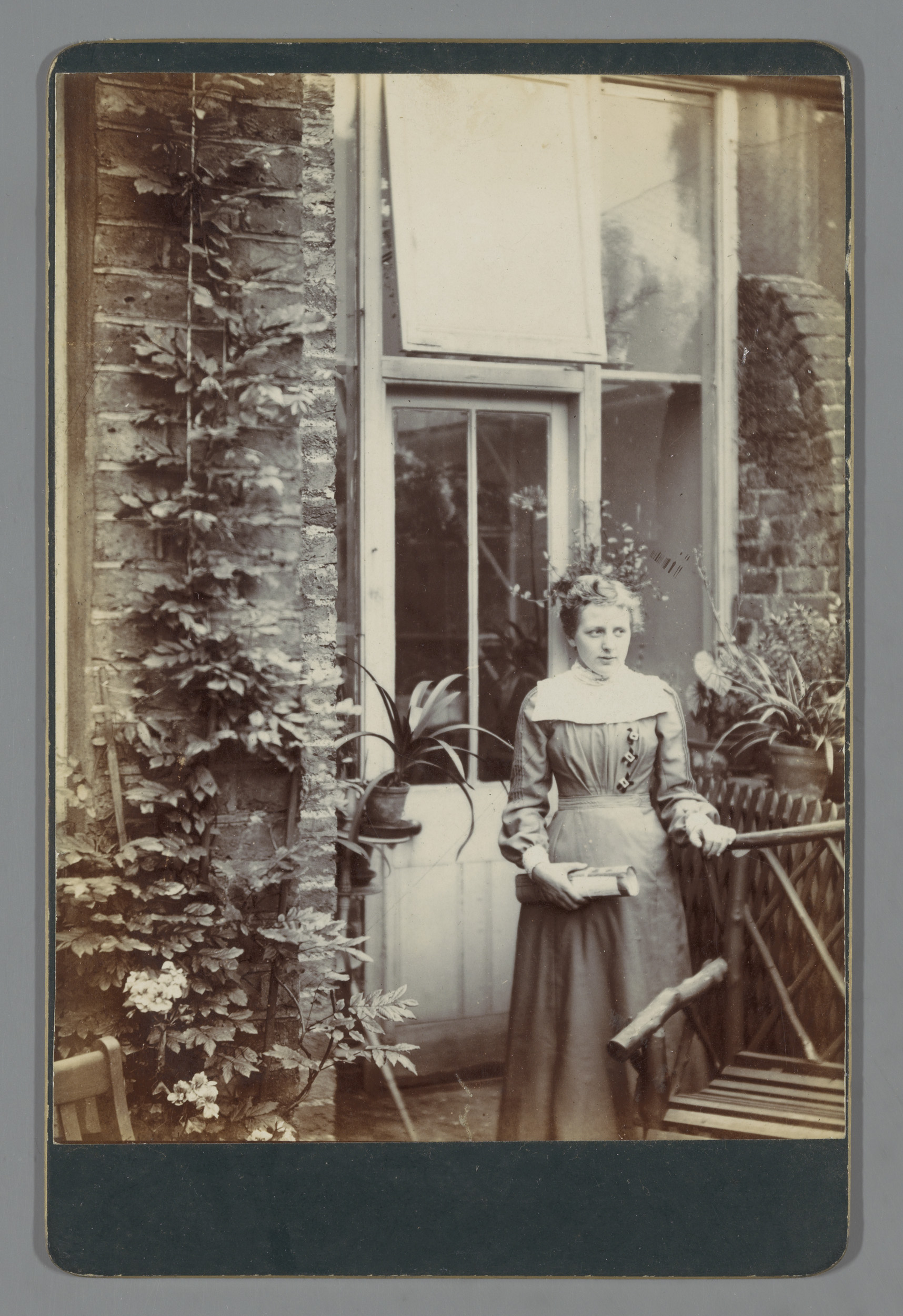 Portret van een jonge vrouw in tuin bij achterdeur v...