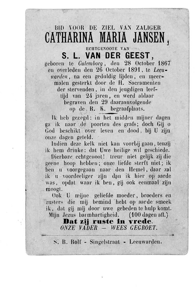 bidprent voor Catharina Maria Jansen. Geboren 28-10-...