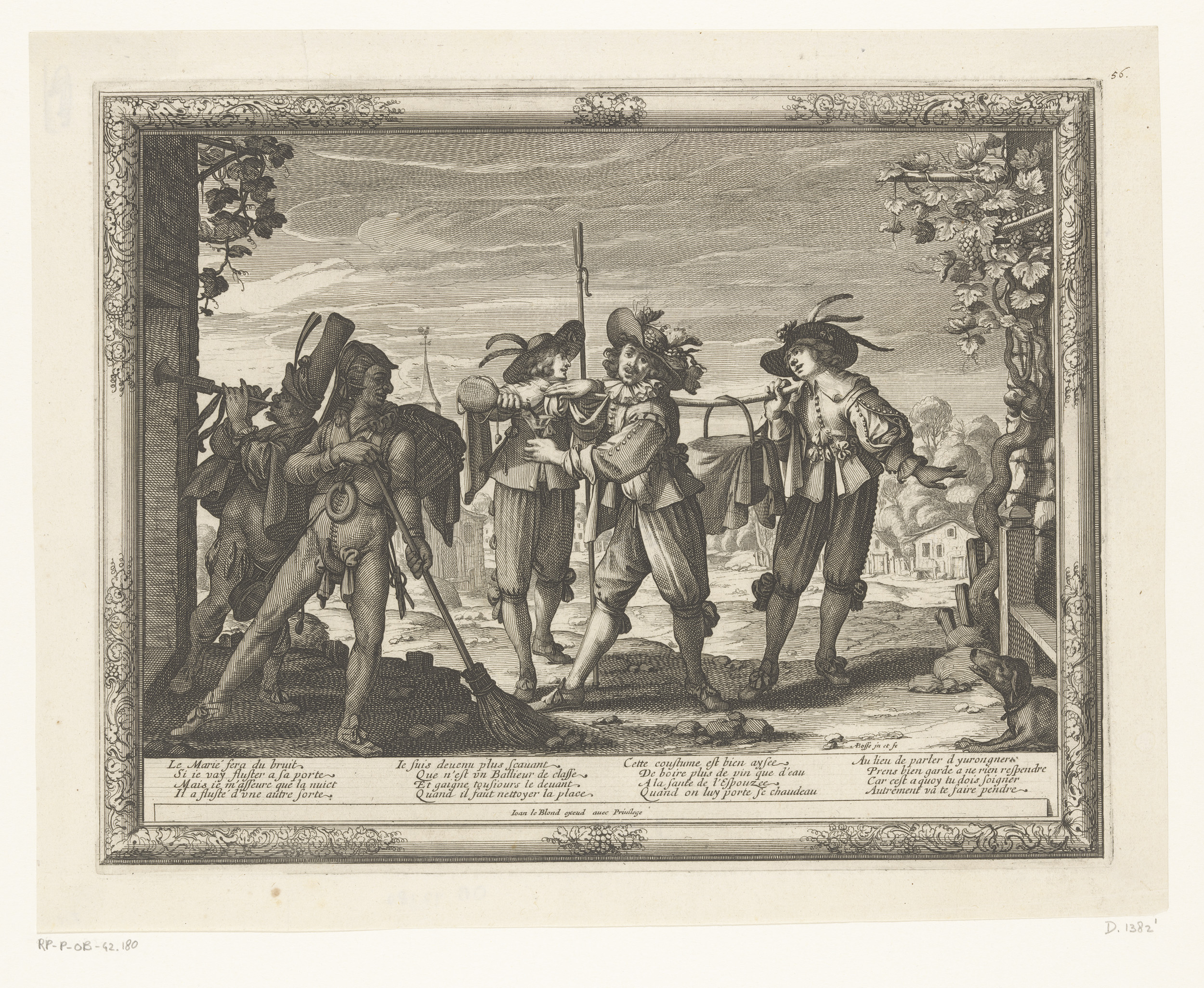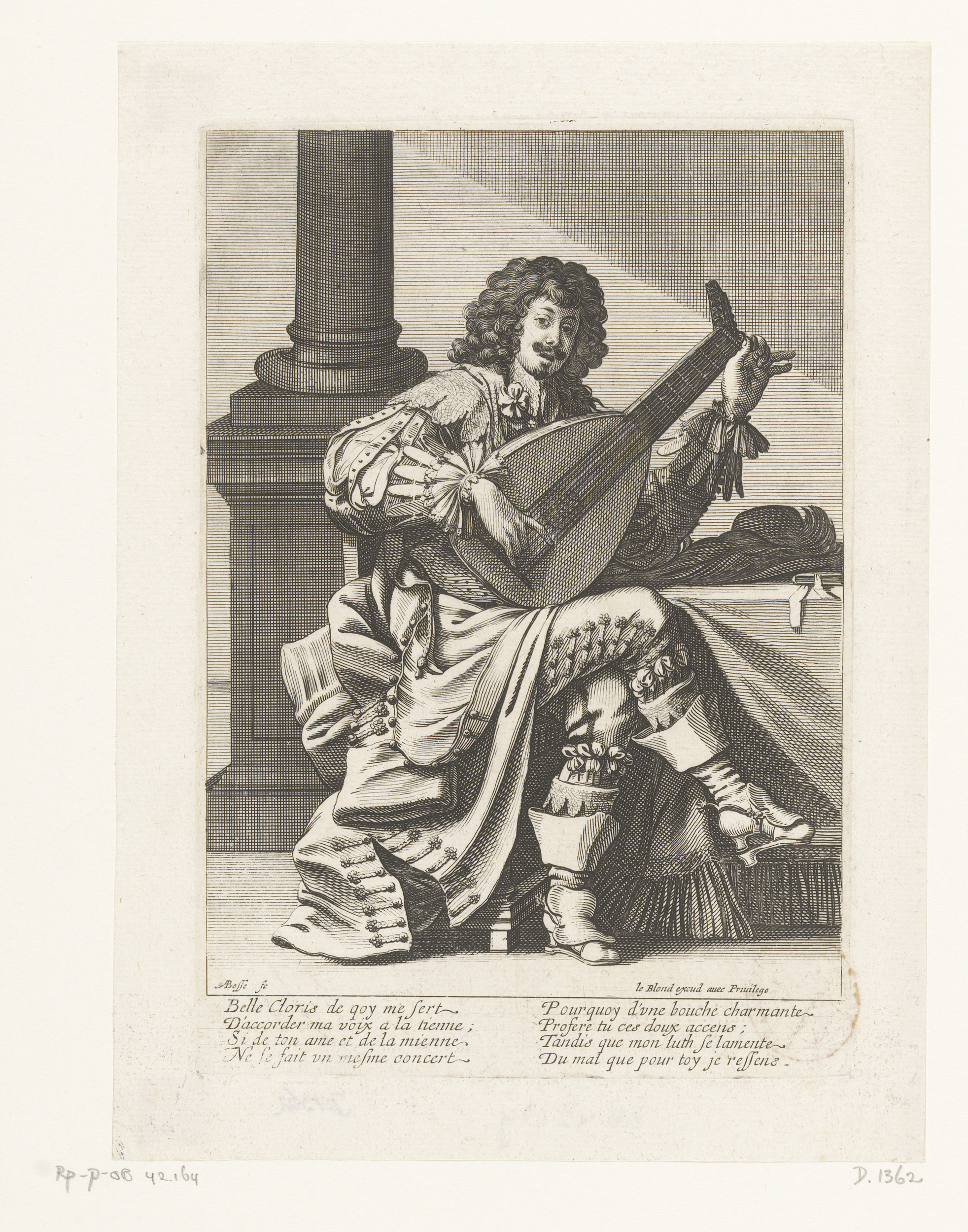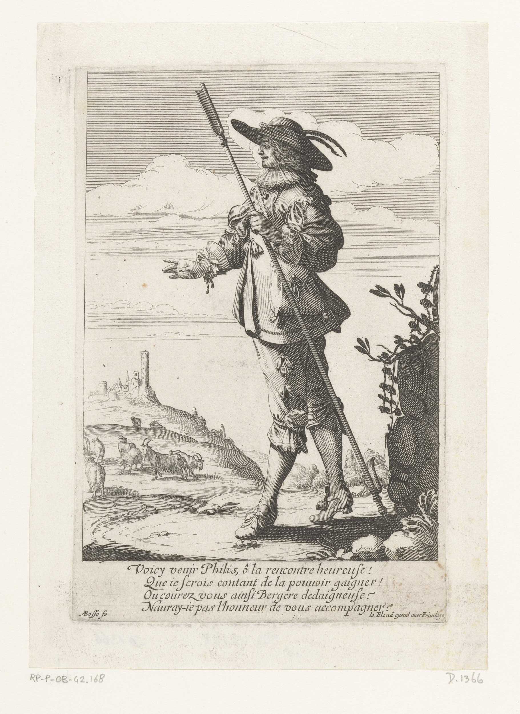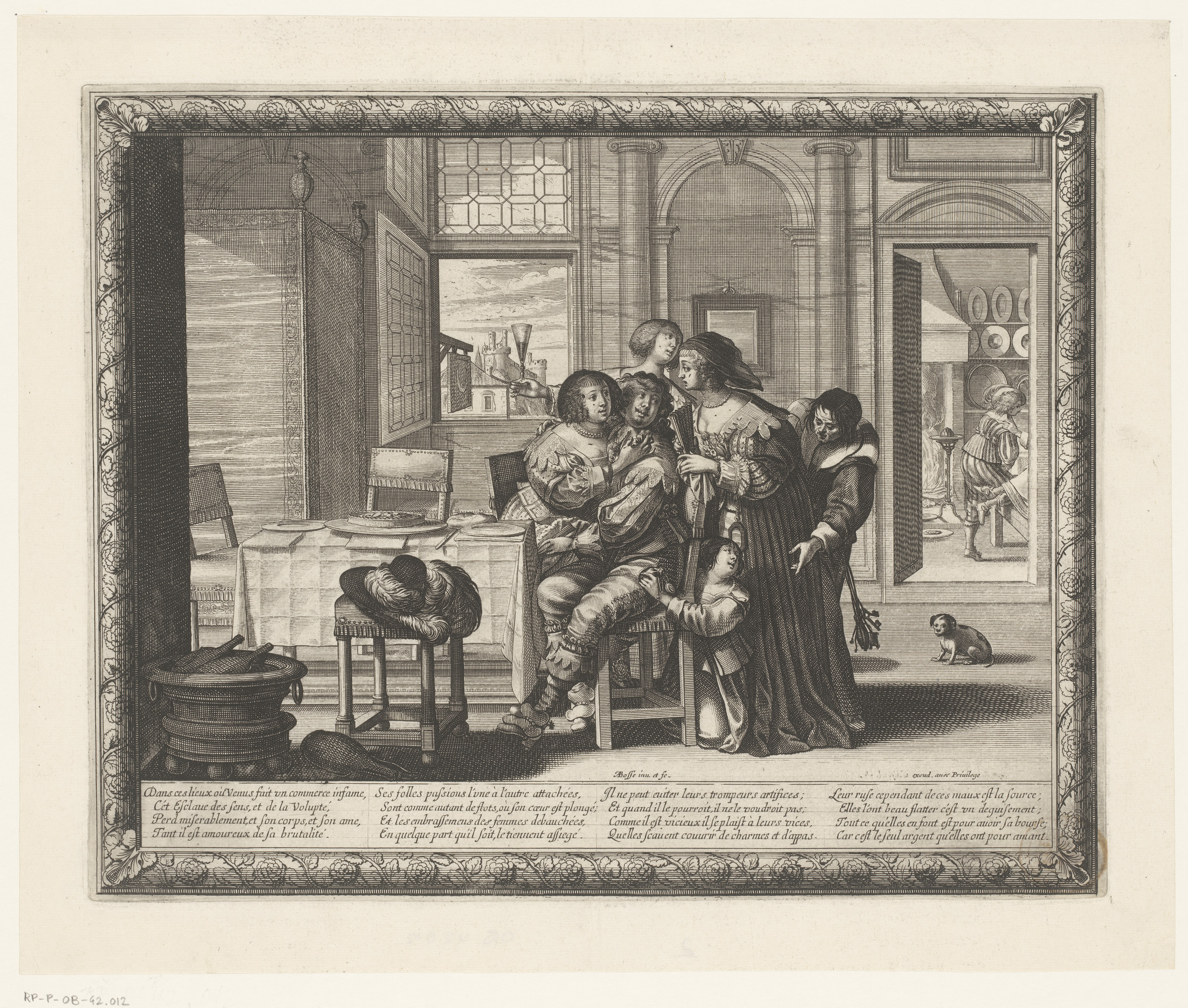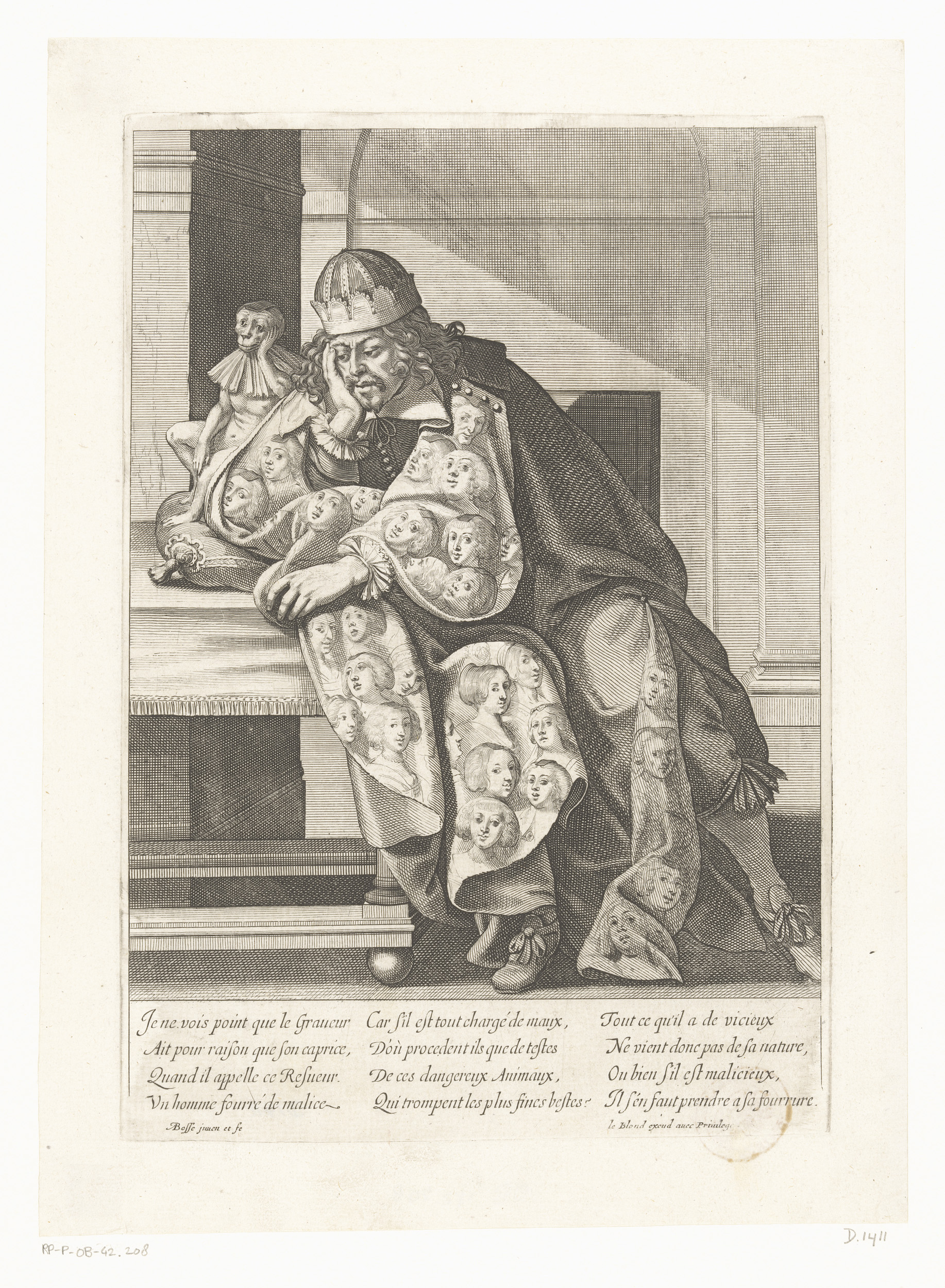 Man met een mantel waarop vrouwenhoofden, leunt op e...