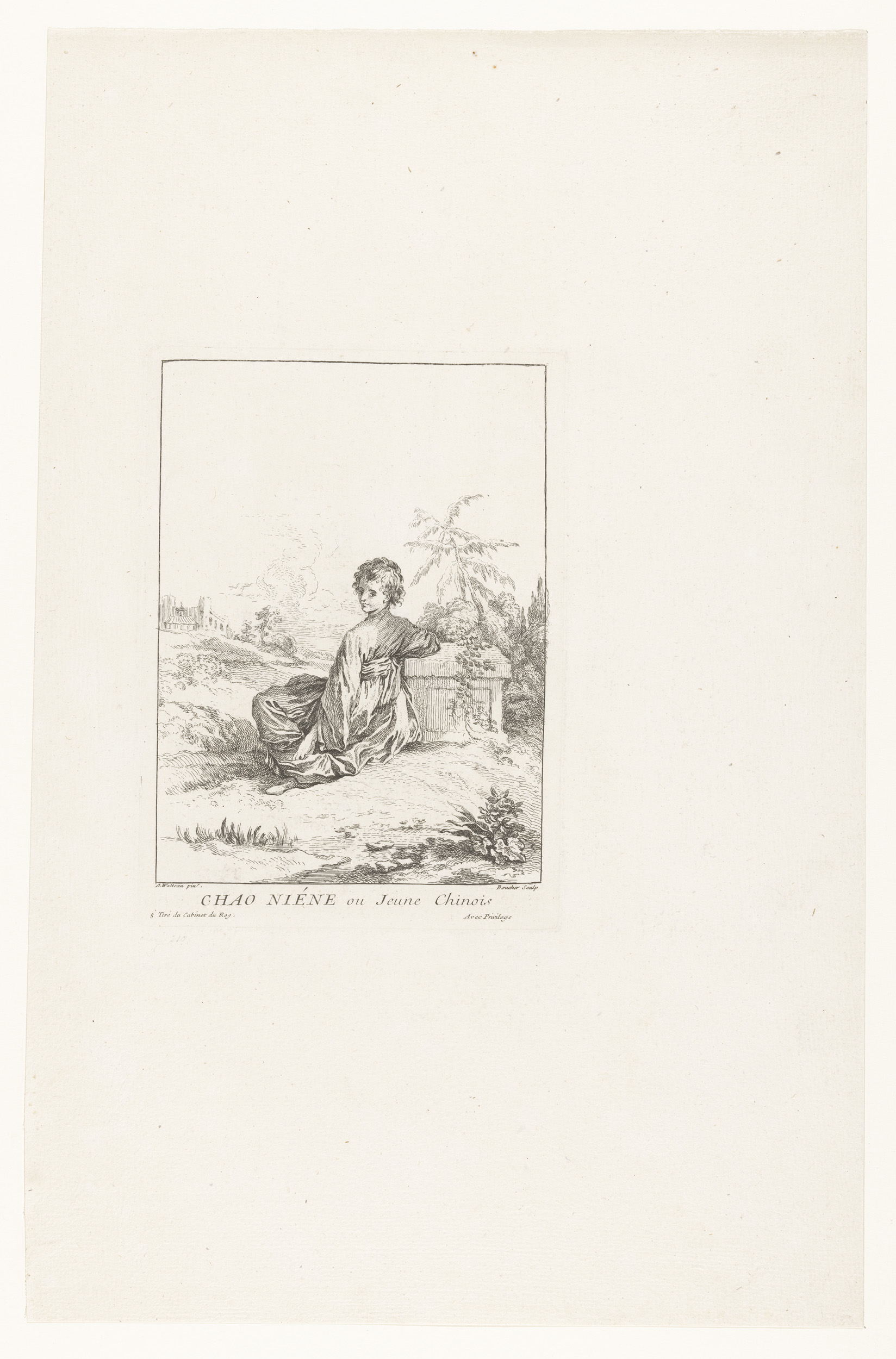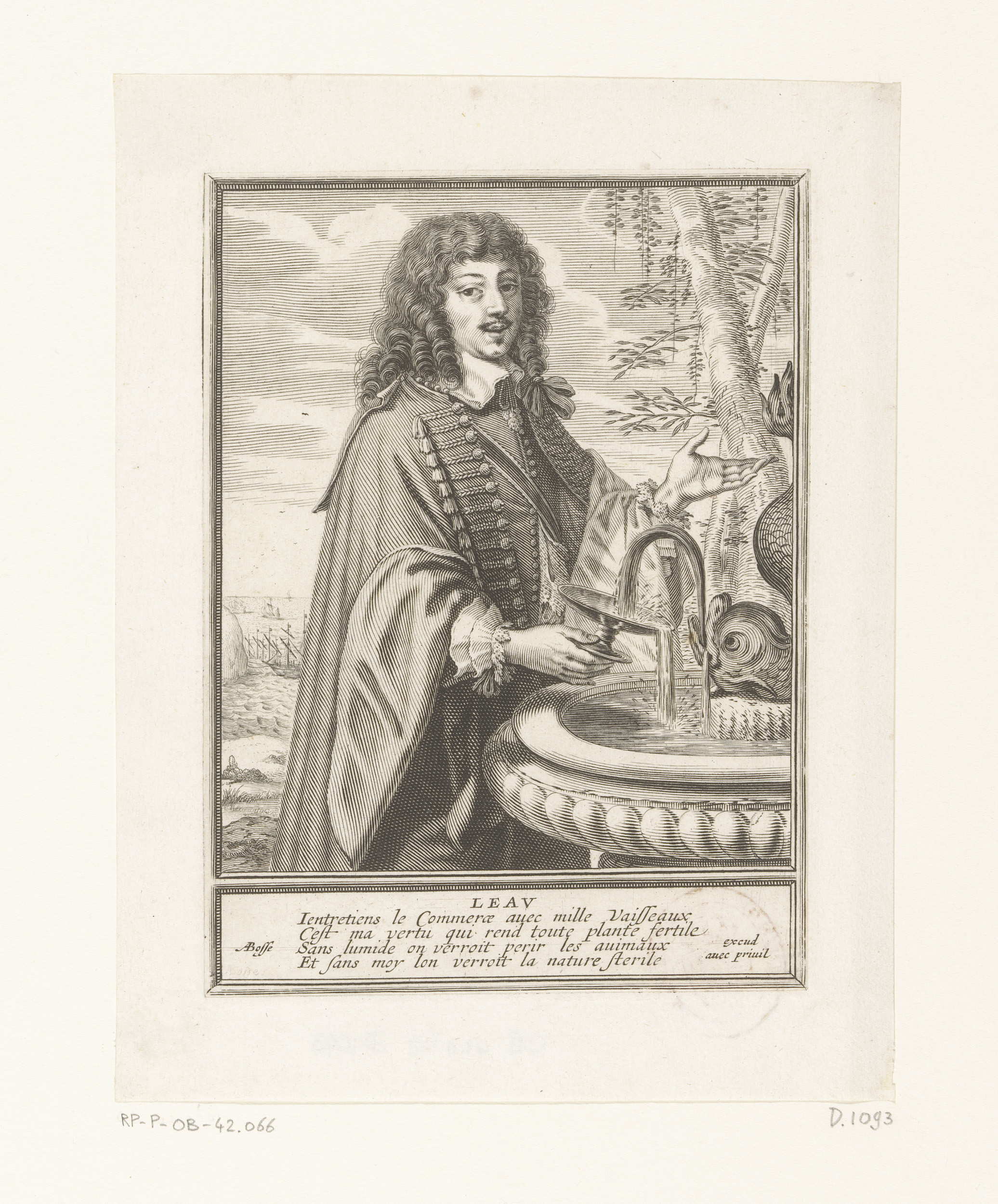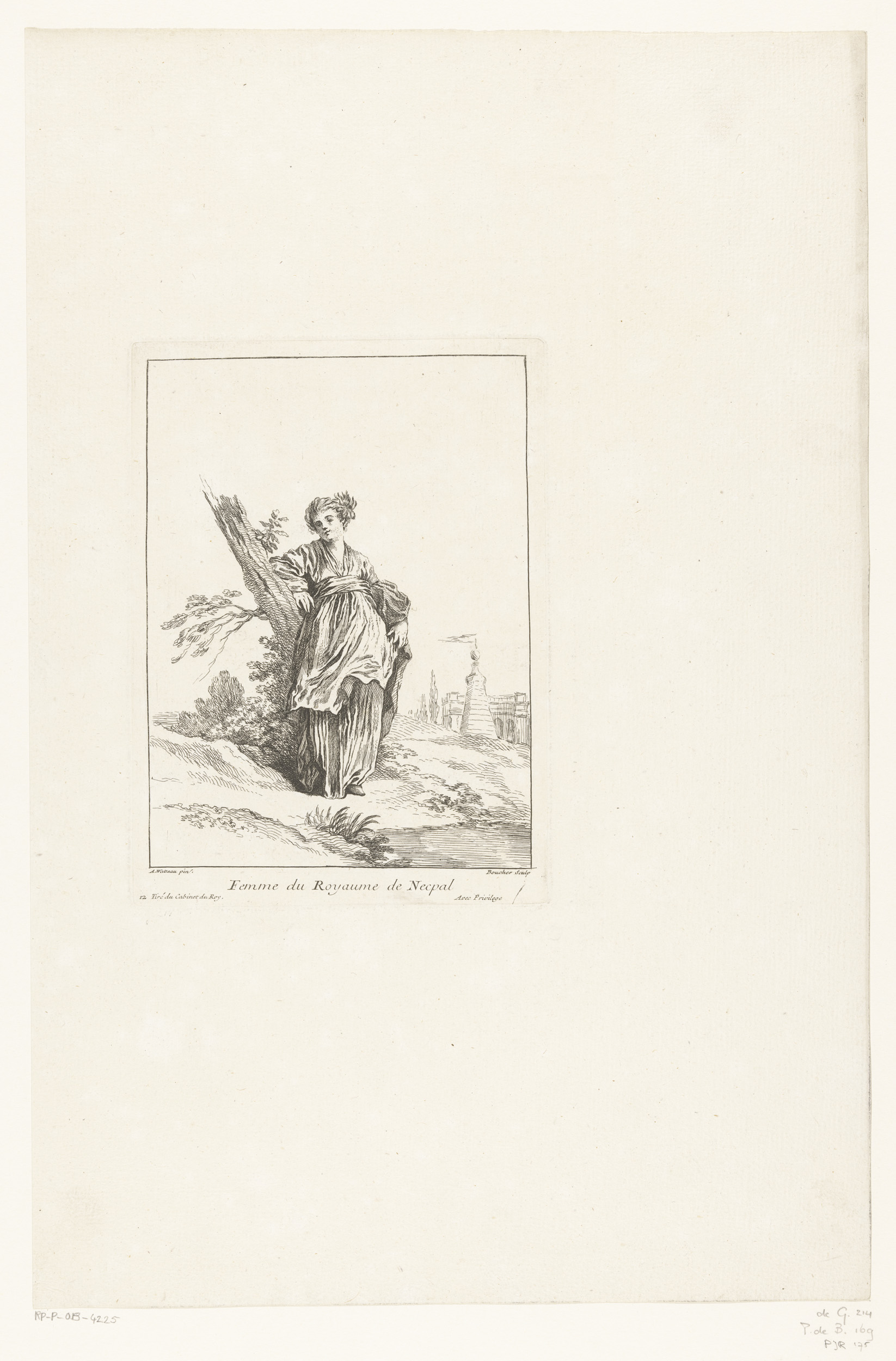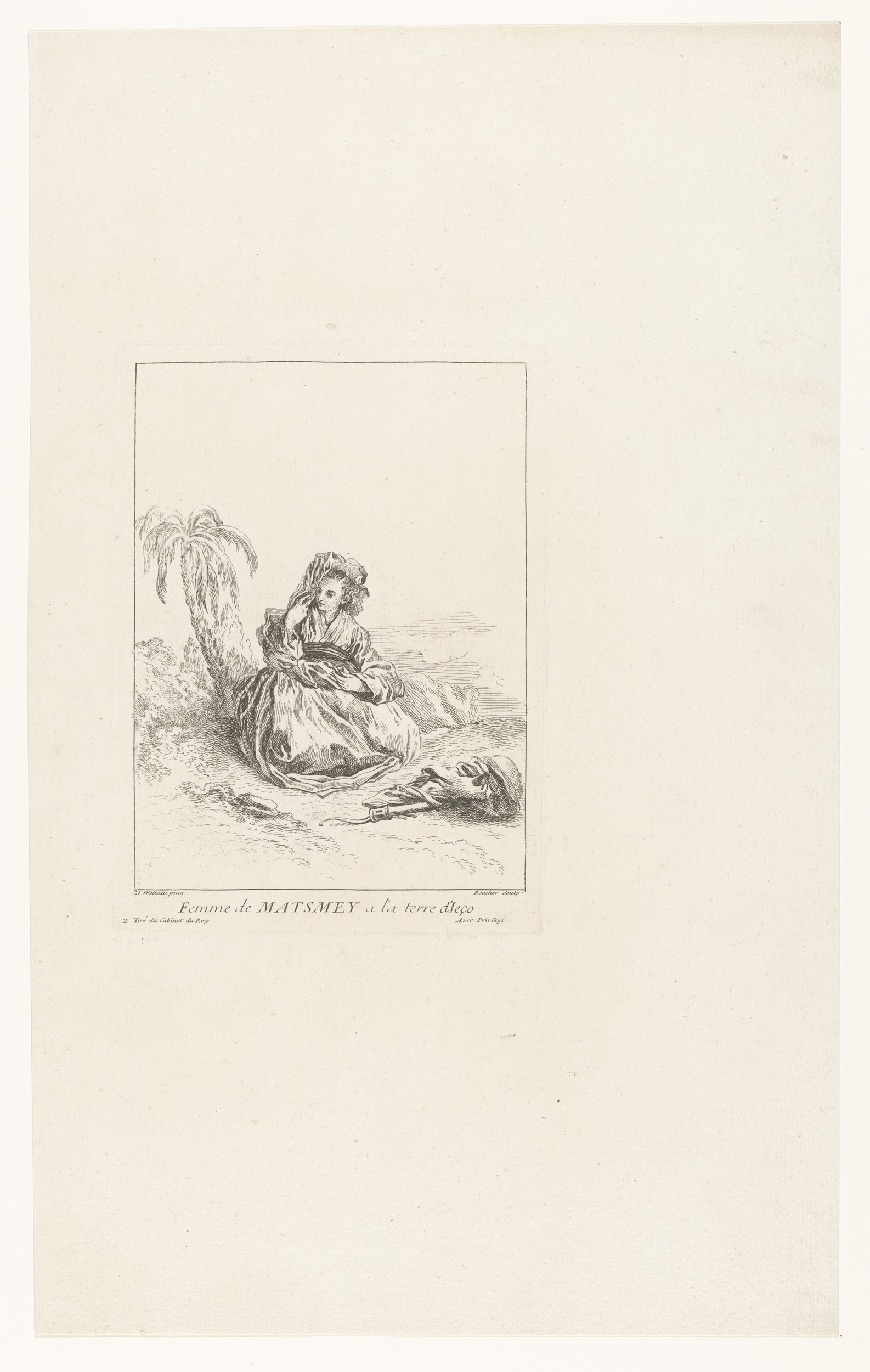 Man met een mantel waarop vrouwenhoofden, leunt op e...