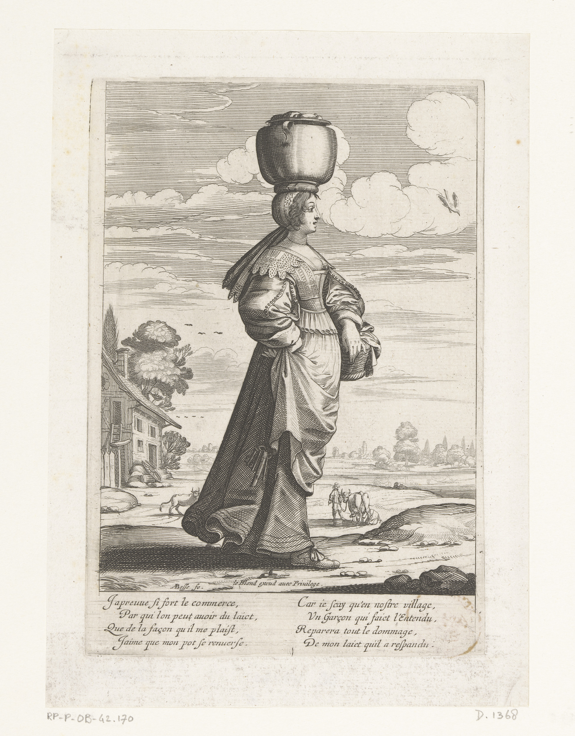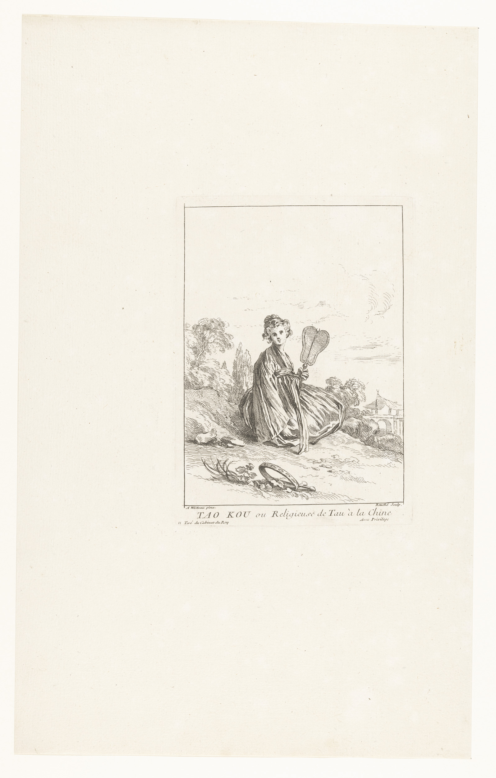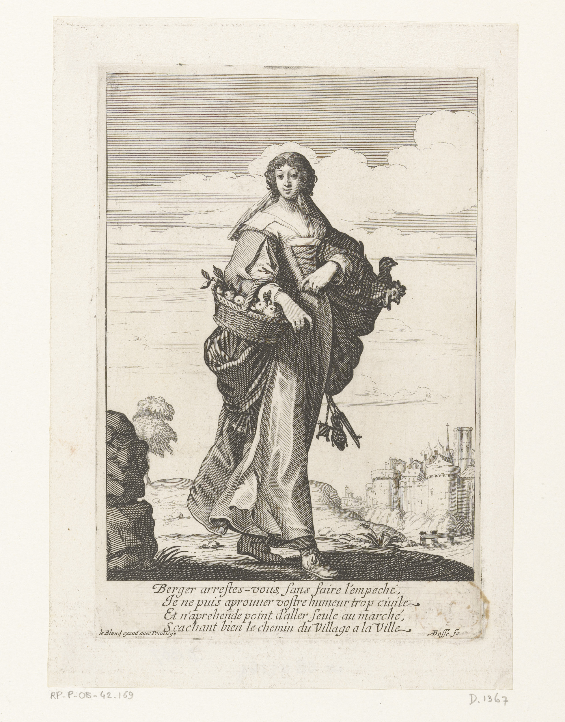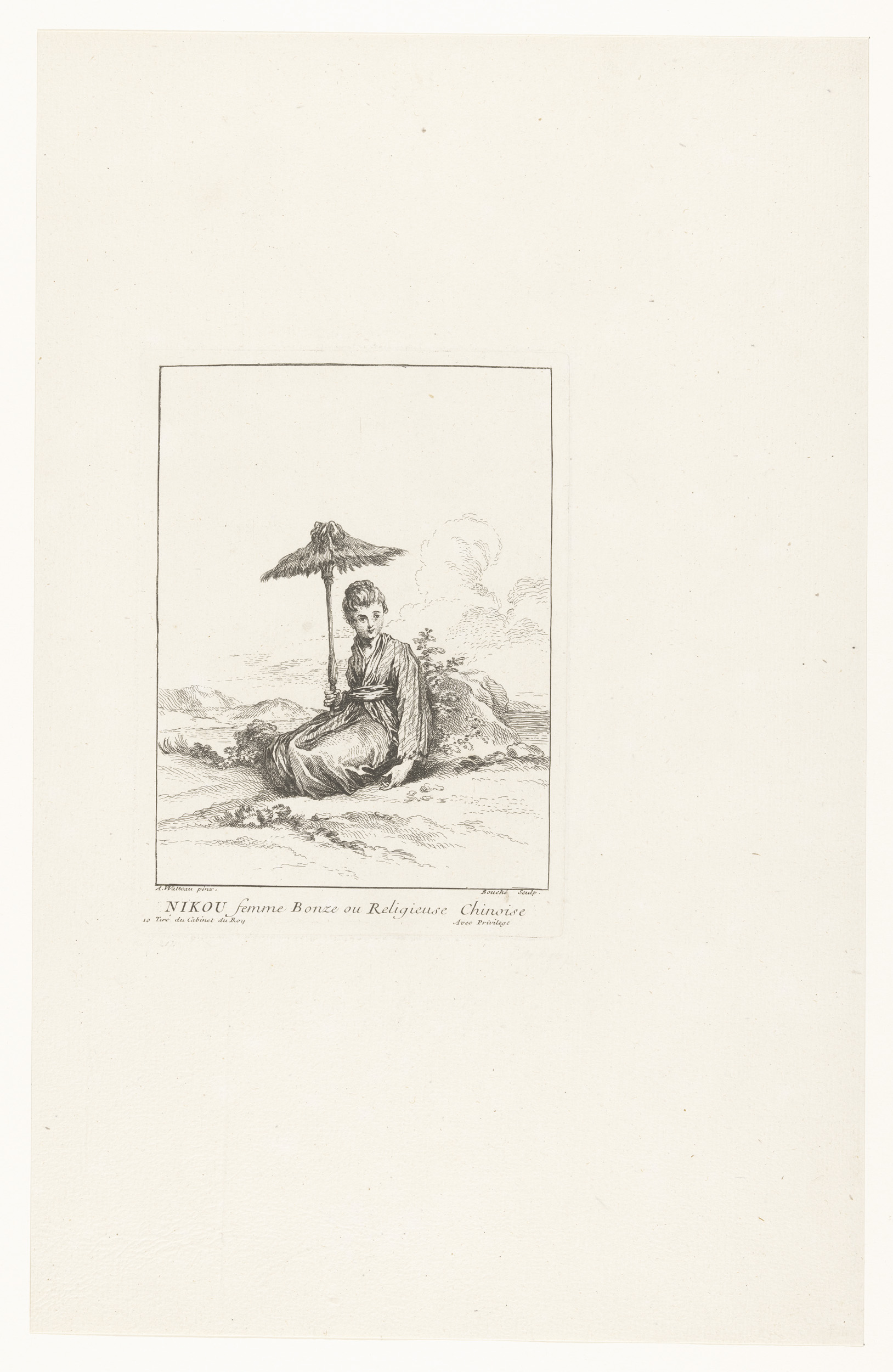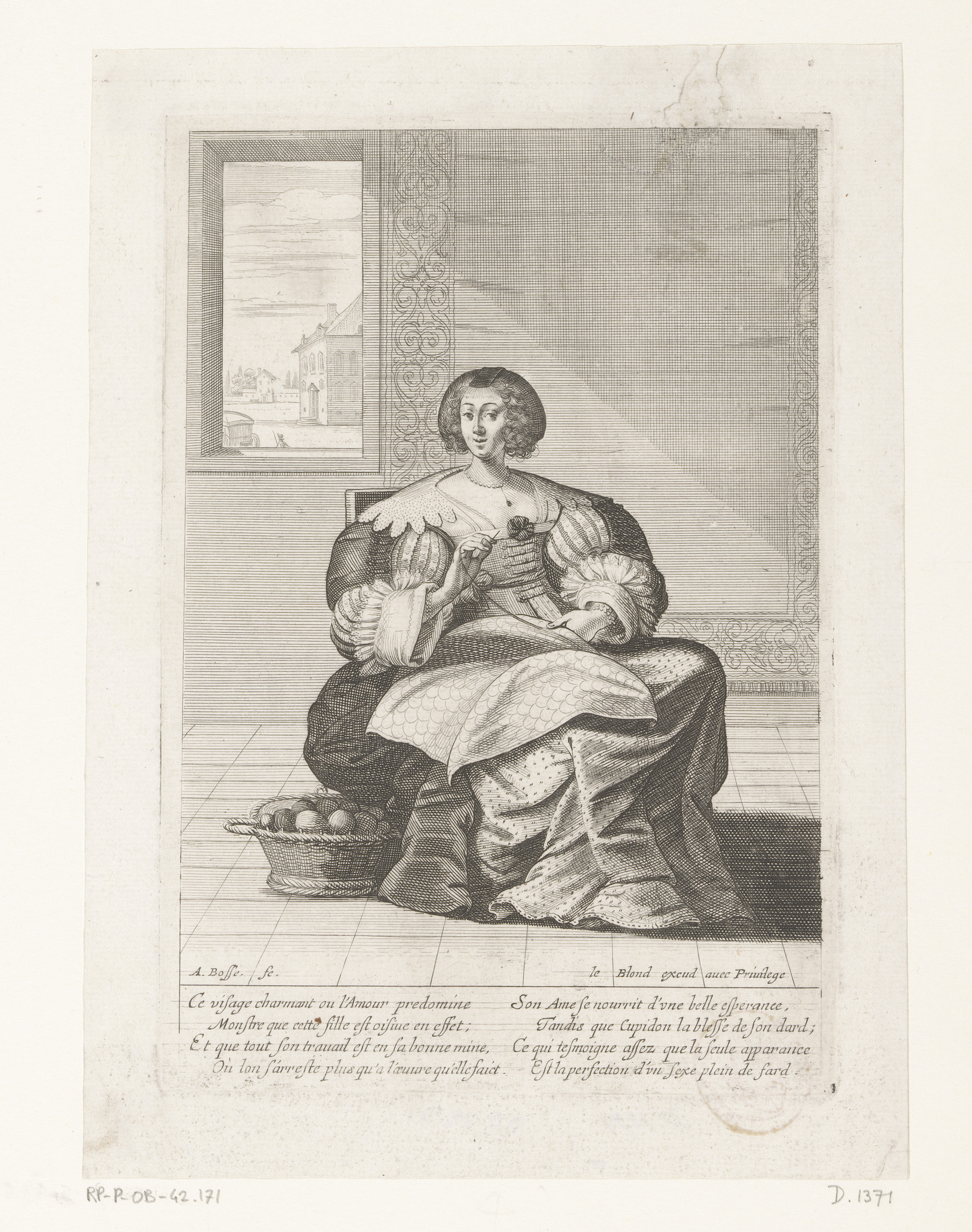Man met een mantel waarop vrouwenhoofden, leunt op e...