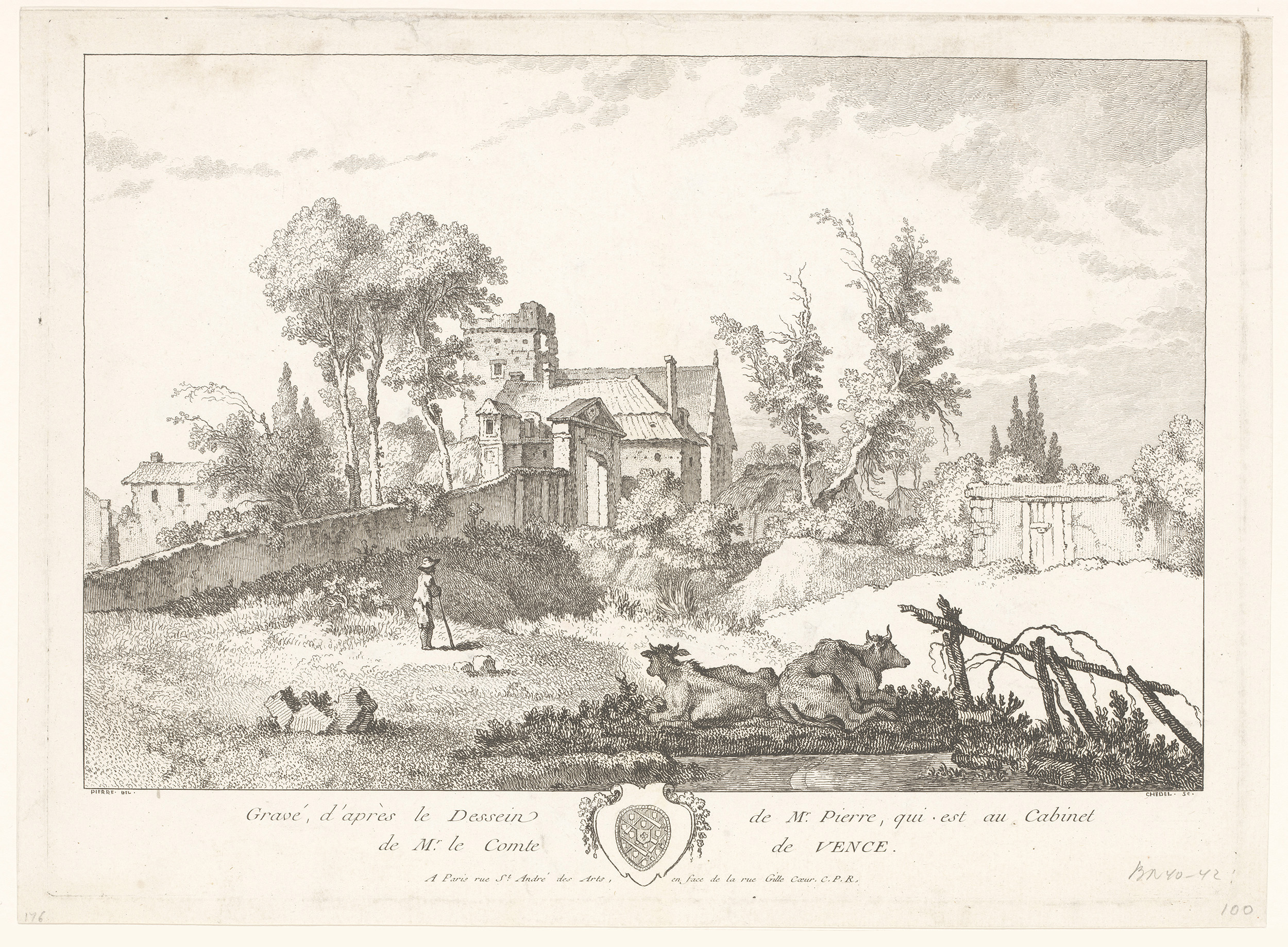 Landschap aan de rand van een dorp, op de voorgrond ...