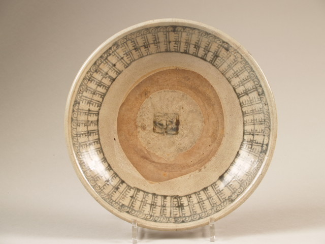 Schaal, grijs geglazuurd, met grijs-blauw decor van ...