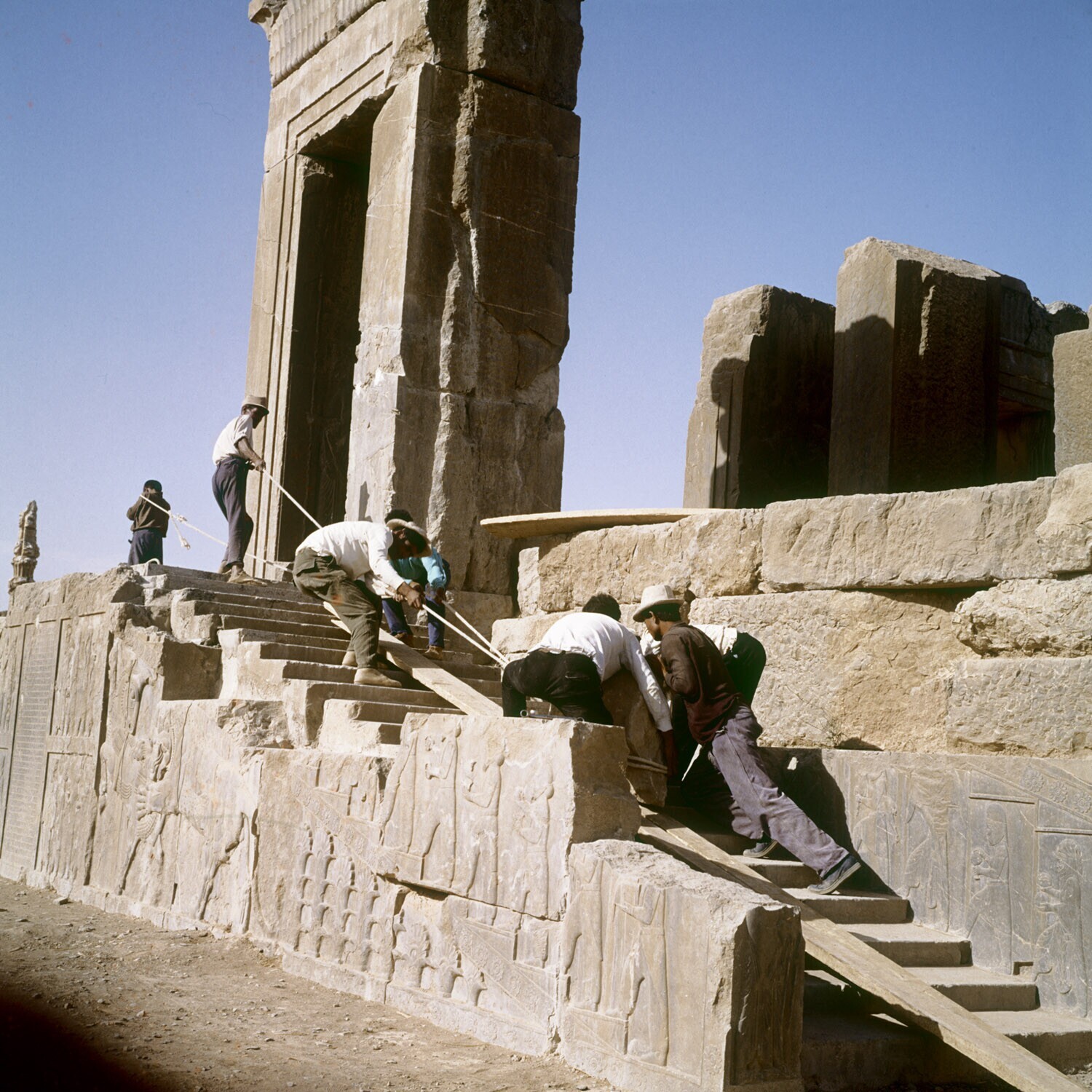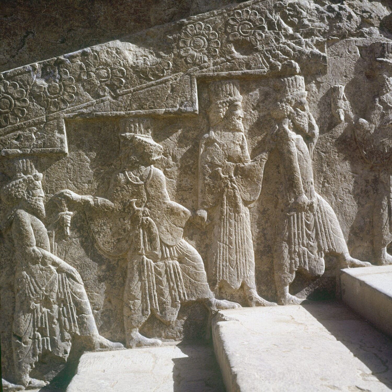 Reliëf van een koning en gevleugelde leeuw in Persep...