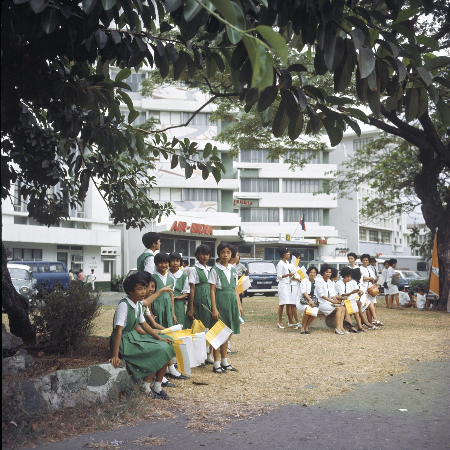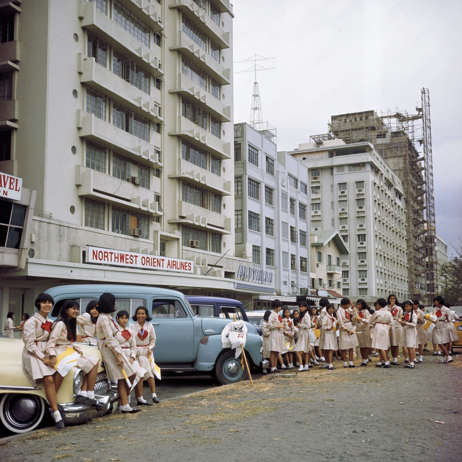 Schoolmeisjes in uniform langs de Roxas Boulevard ma...