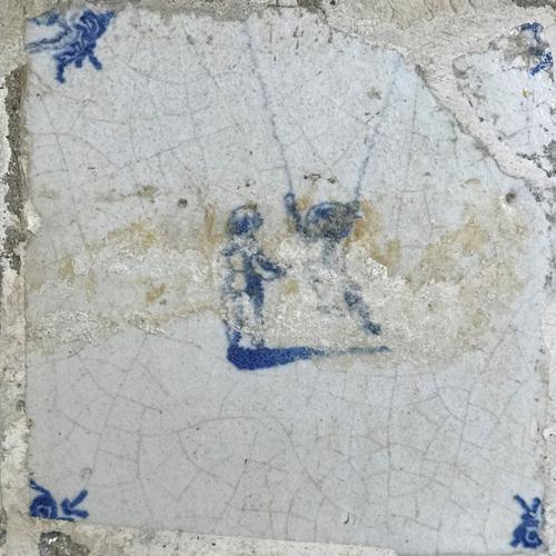 Tegel van aardewerk met tinglazuur voorstellende klo...