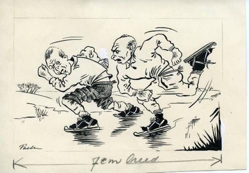 Tekening in zwart-wit van twee schaatsers
