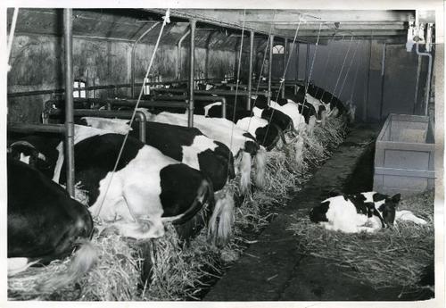 Foto in zwart-wit van koeien op een Hollandse stal d...