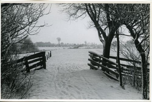Foto in zwart-wit van een pad door een hek naar een ...
