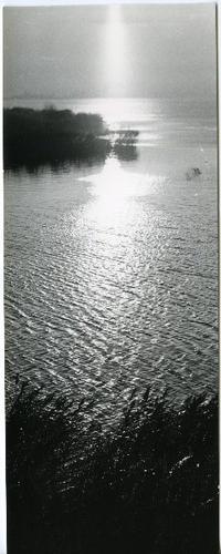 Foto in zwart-wit van een meer met rietkraag, 1965