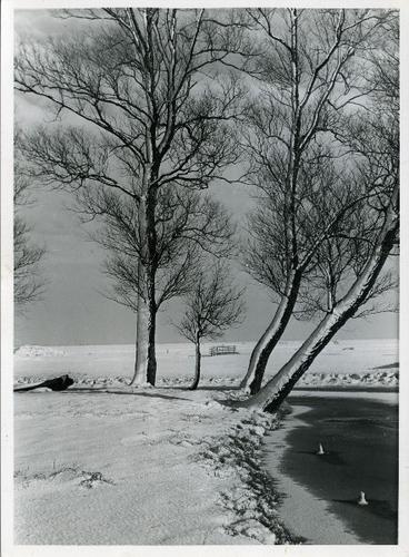 Foto in zwart-wit van bomen aan een bevroren vaart d...
