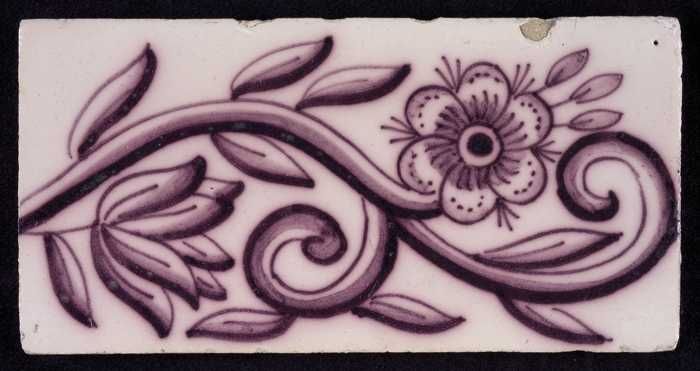 Randtegel, paars op wit, gekrulde bladrank met bloemen