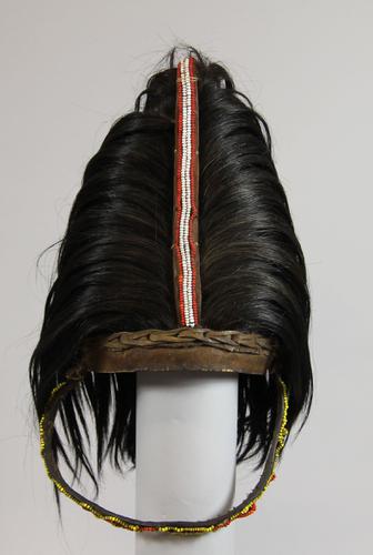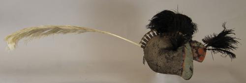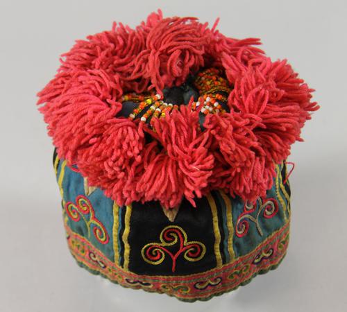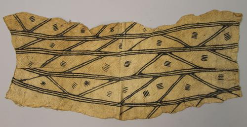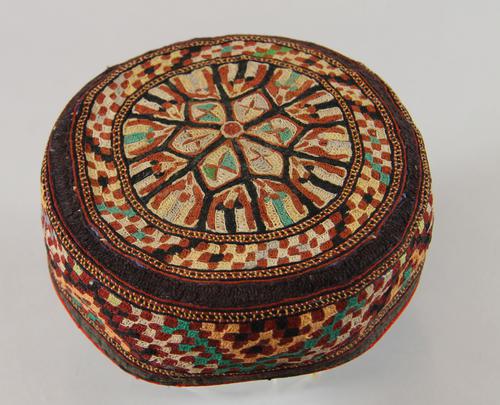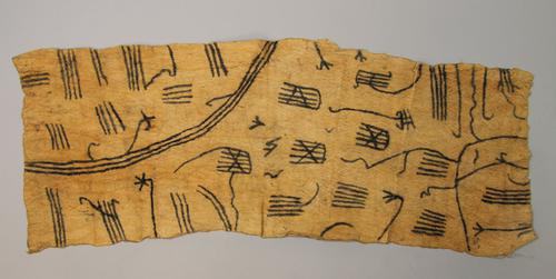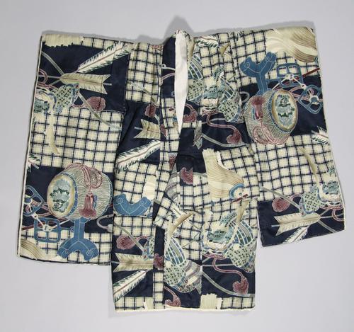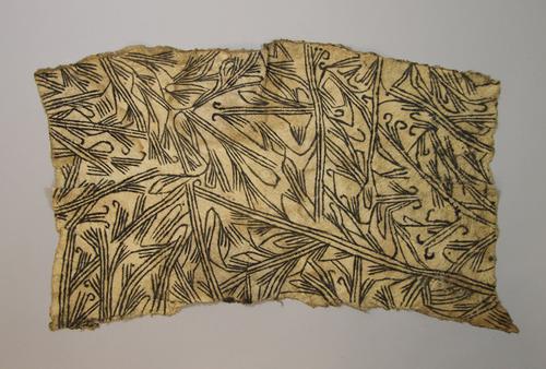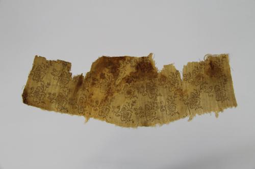 : Silk (ground and lining) with several types of metal thread; metal thread lace and plaited band and sequins; linen (interlining) (1)