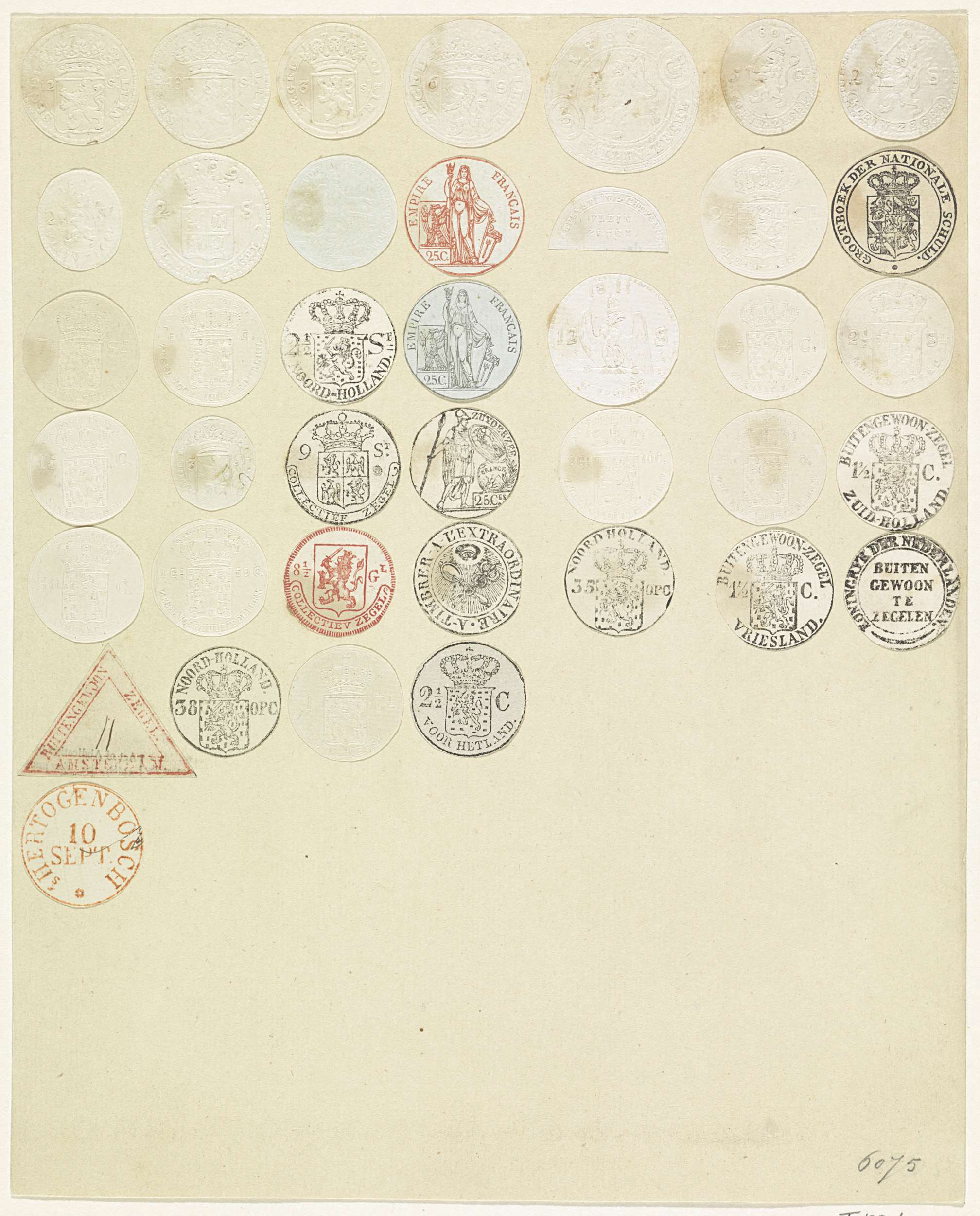 Blad met uitgeknipte Nederlandse en Franse zegels