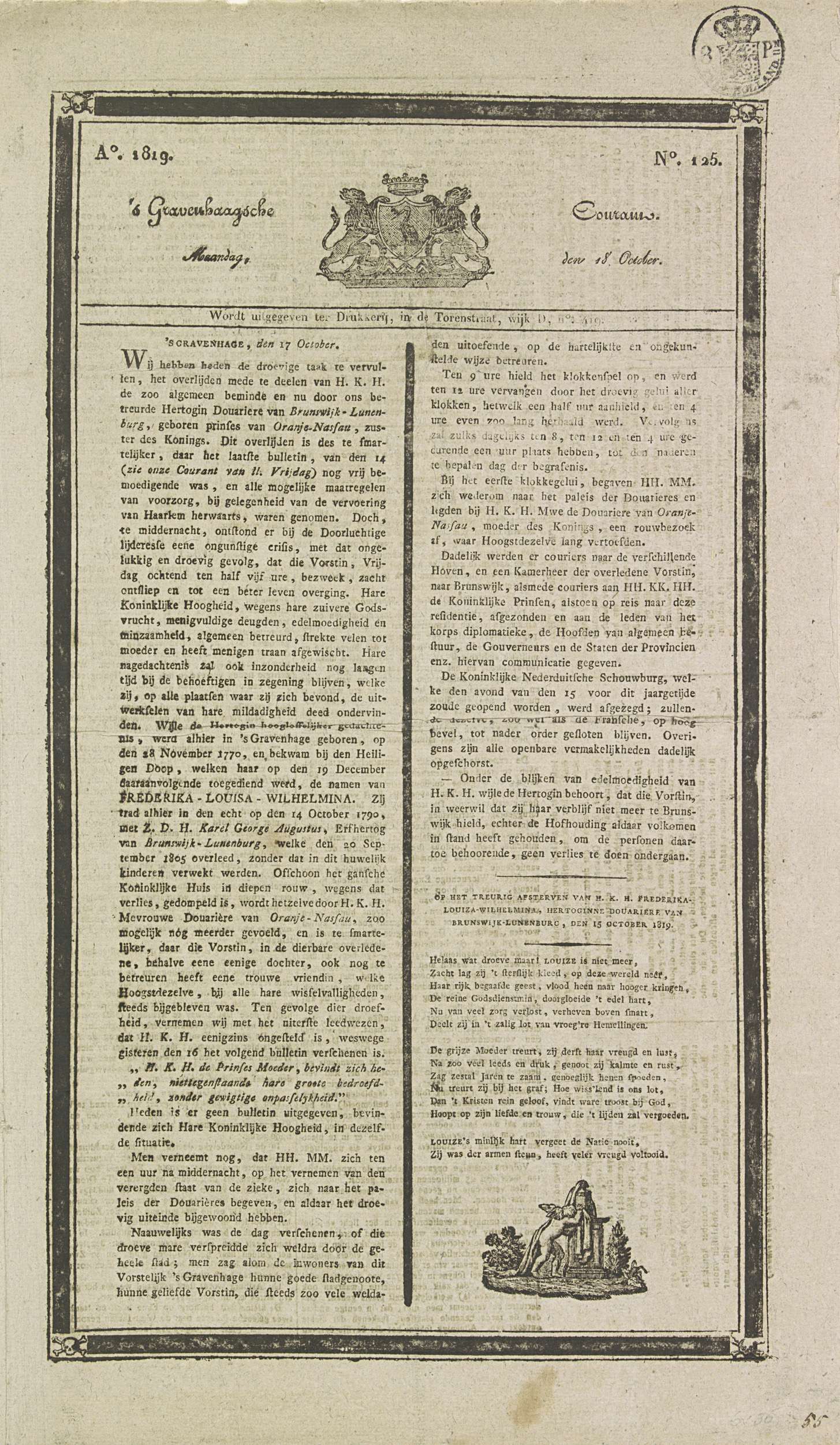 Vers op het overlijden van Wilhelmina prinses-douair...