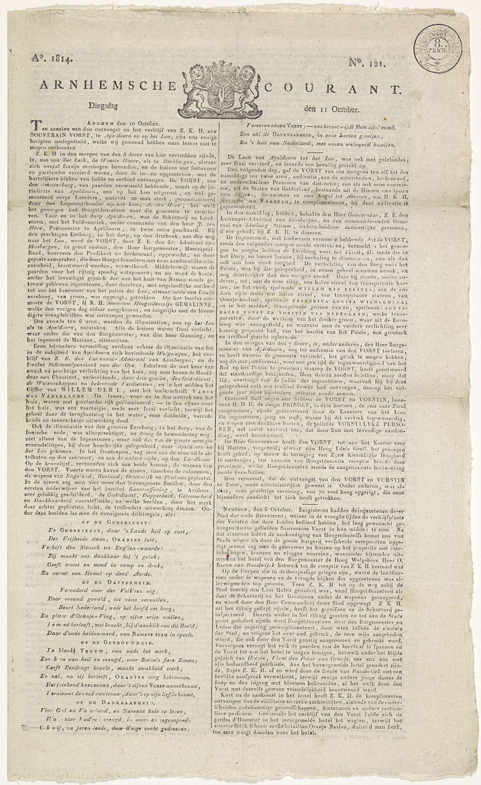 Arnhemsche Courant. Ao. 1814 No. 121. Dingsdag den 1...