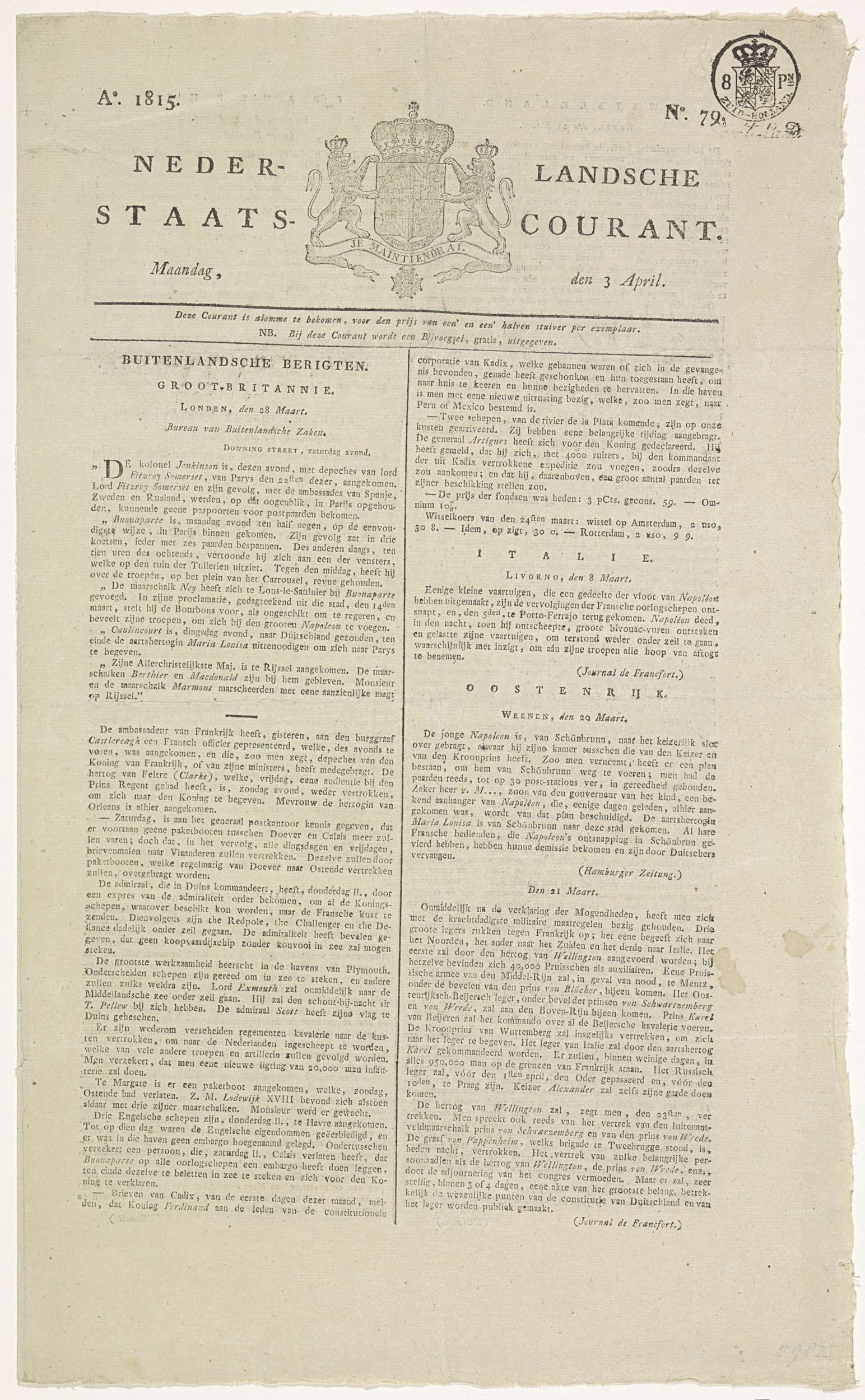 Nederlandsche Staatscourant. Ao. 1815 No. 79. Maanda...