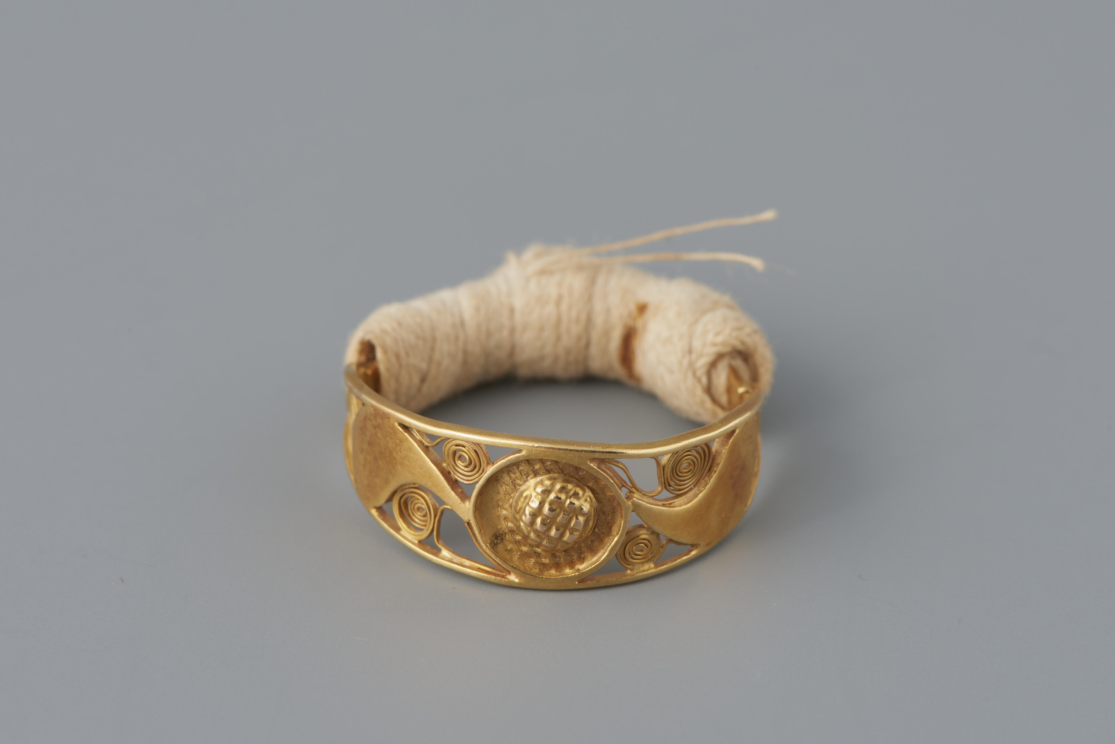 Verguld messing oorijzer met gouden stiften uit Frie...
