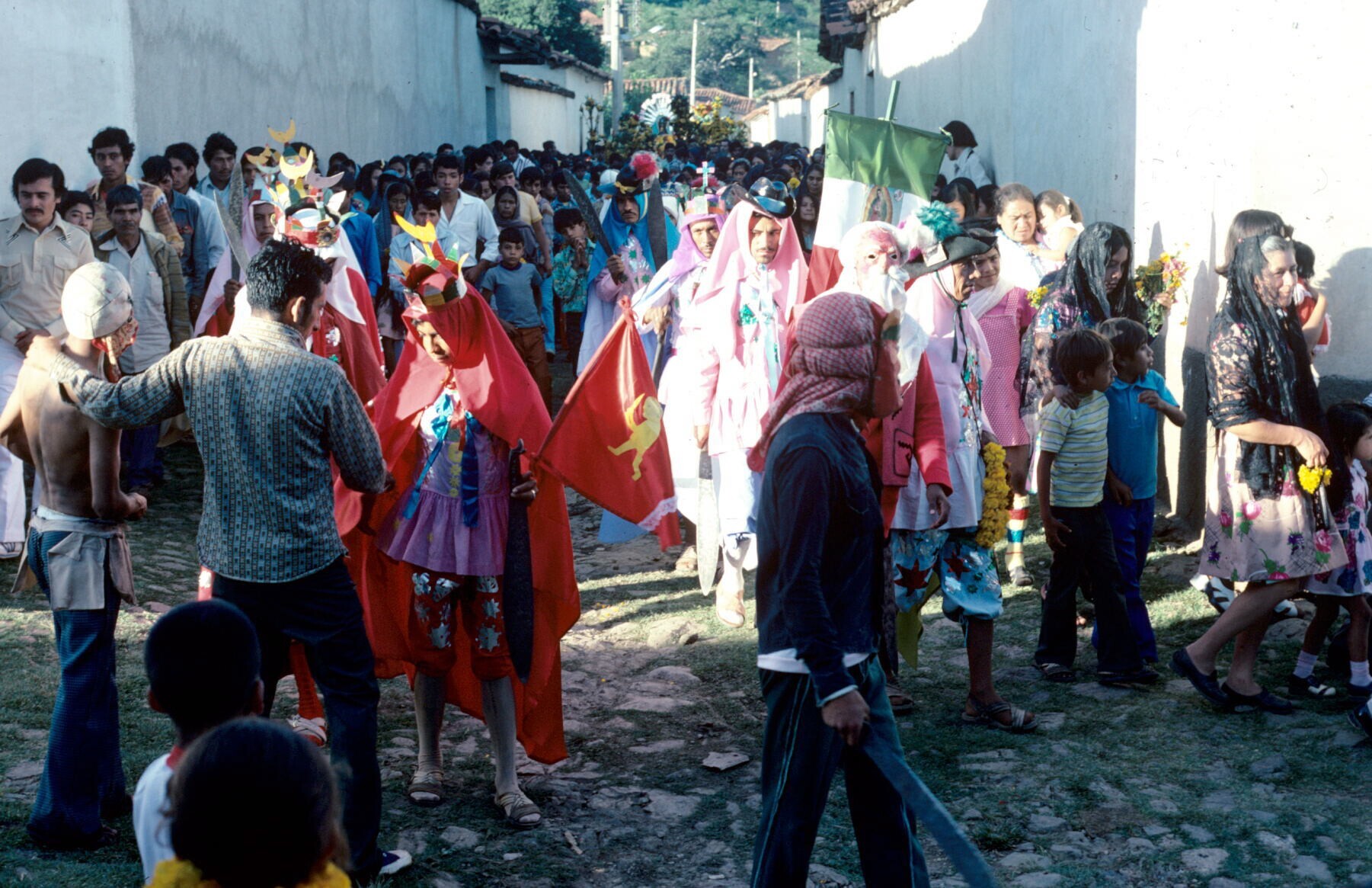 publiek en gekostumeerde figuren bij processie
